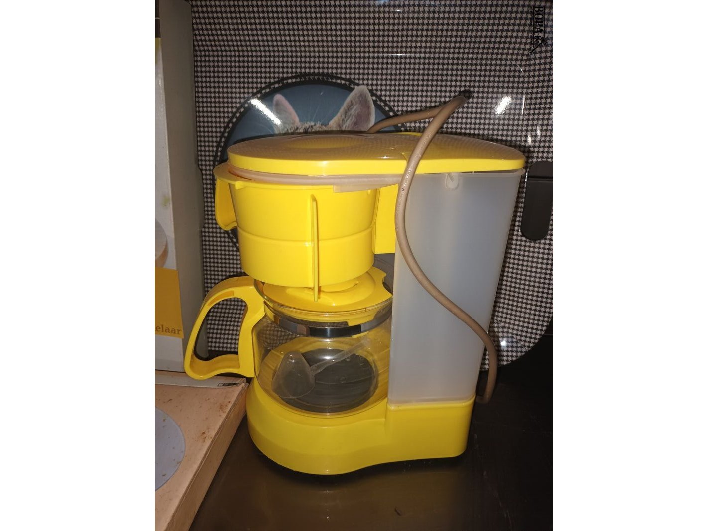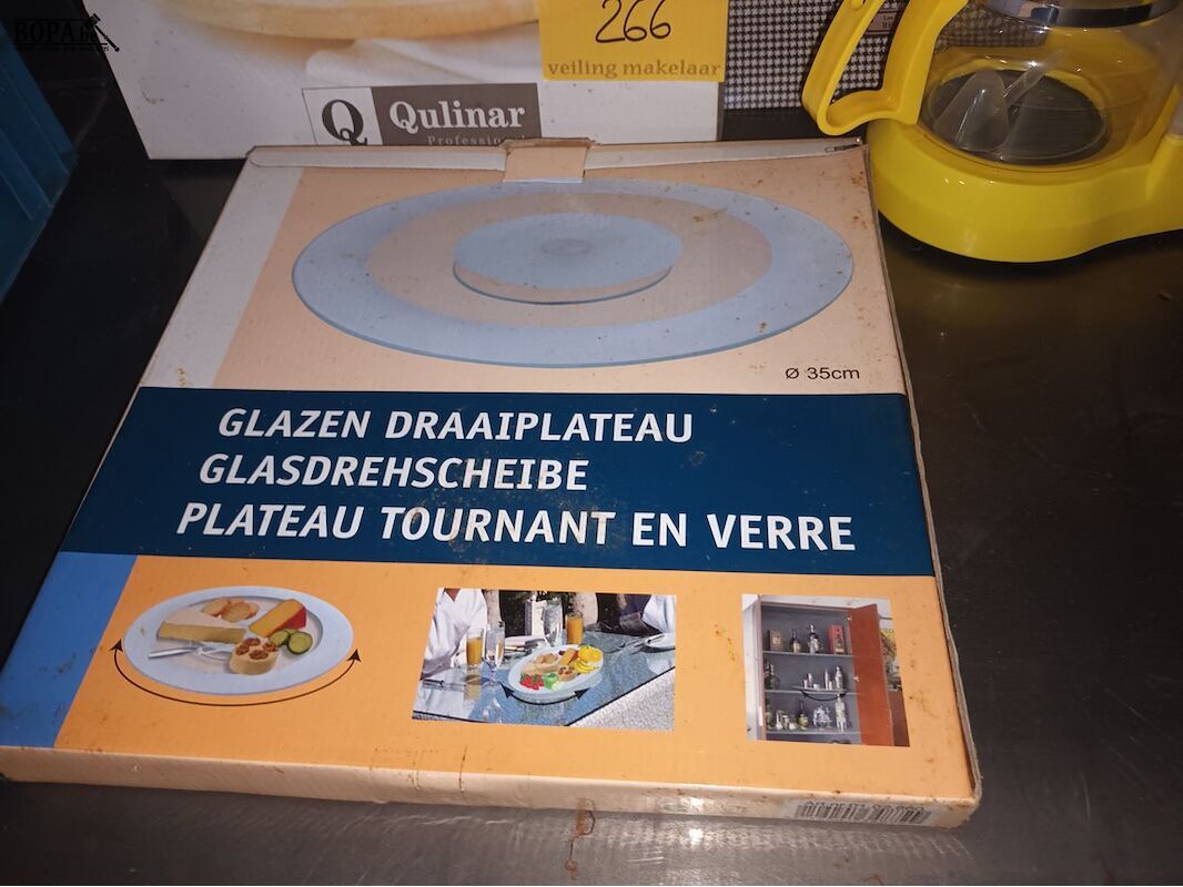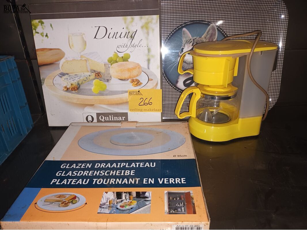 Keukengerei. 4 stuks. Draaiplateau’s, koffiezetapparaat en dienblad.