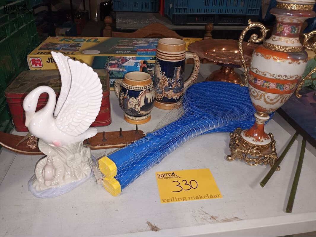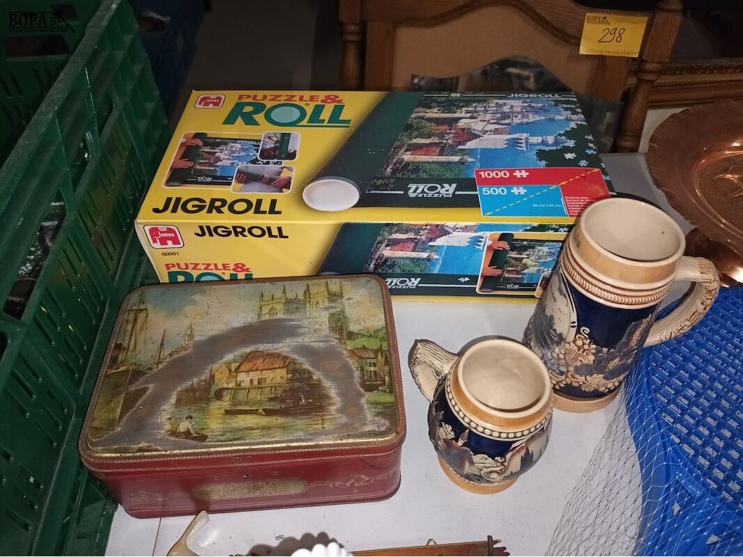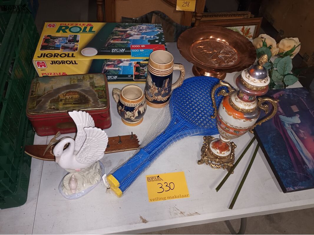 Diversen. 15 stuks. Decoratie, puzzelmat, rackets, blikken doos, bierpotten, etc. Bak niet inbegrepen.