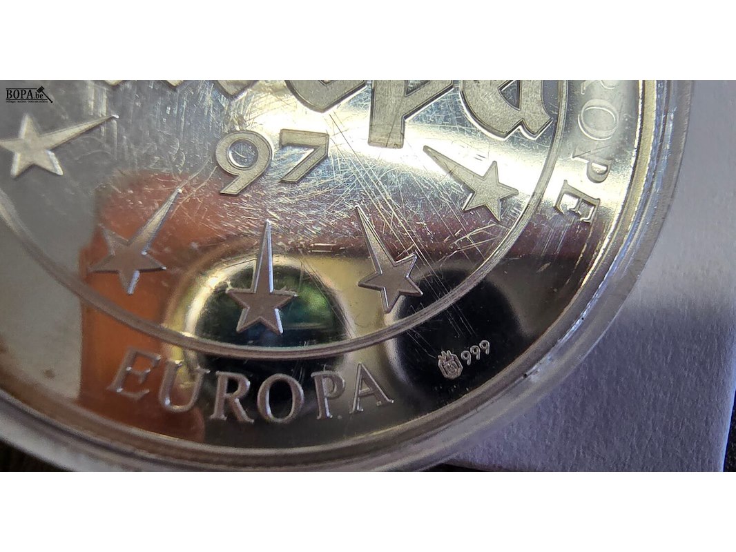 Lot bestaande uit 3 herdenkingsmunten Europa 97 (.999 zilver) met Europese thema’s (o.a. Duitsland, Portugal en Ierland). In capsules, met 2 waarborgcertificaten.(niet zeker bijhorend) Capsules met gebruikssporen.
