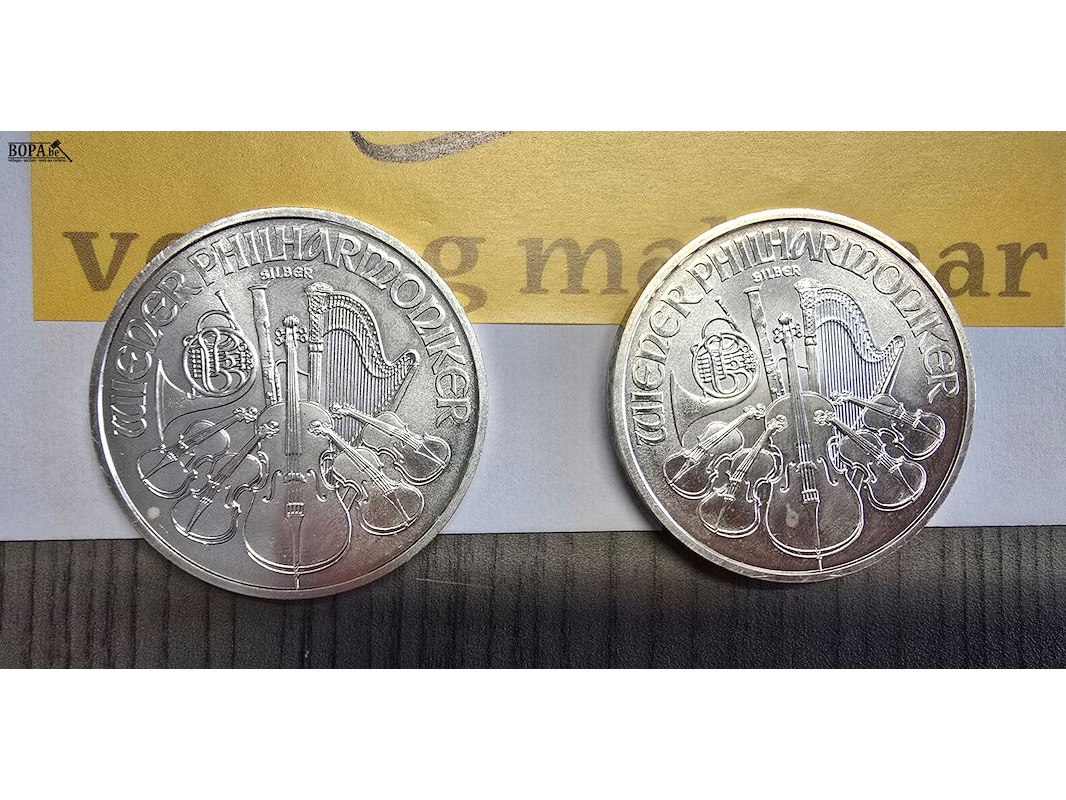 Lot bestaande uit 2 identieke zilveren munten: Wiener Philharmoniker / Republik Österreich – 1 oz fijnzilver (2022). Normale gebruikssporen.