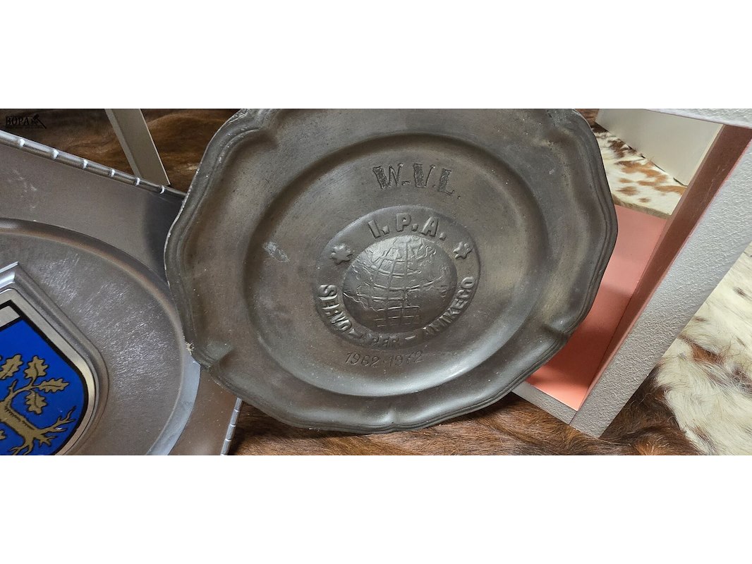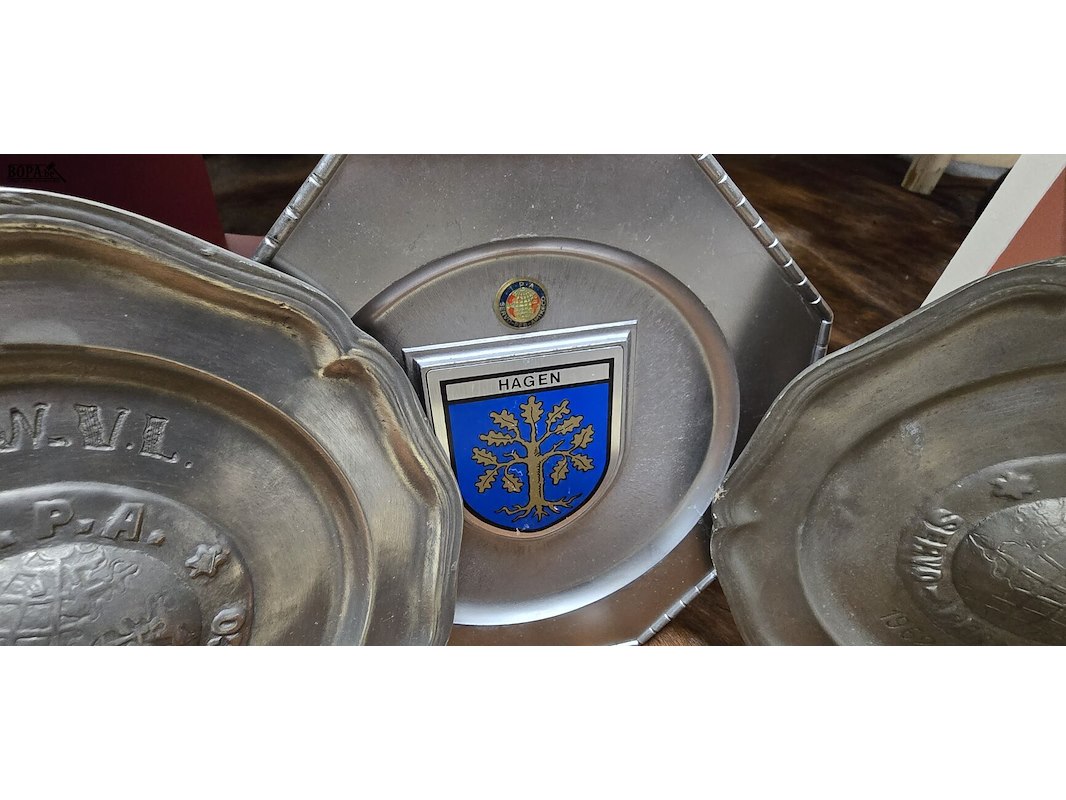 Tinnen aandenken borden 3 stuks + Leiesteen