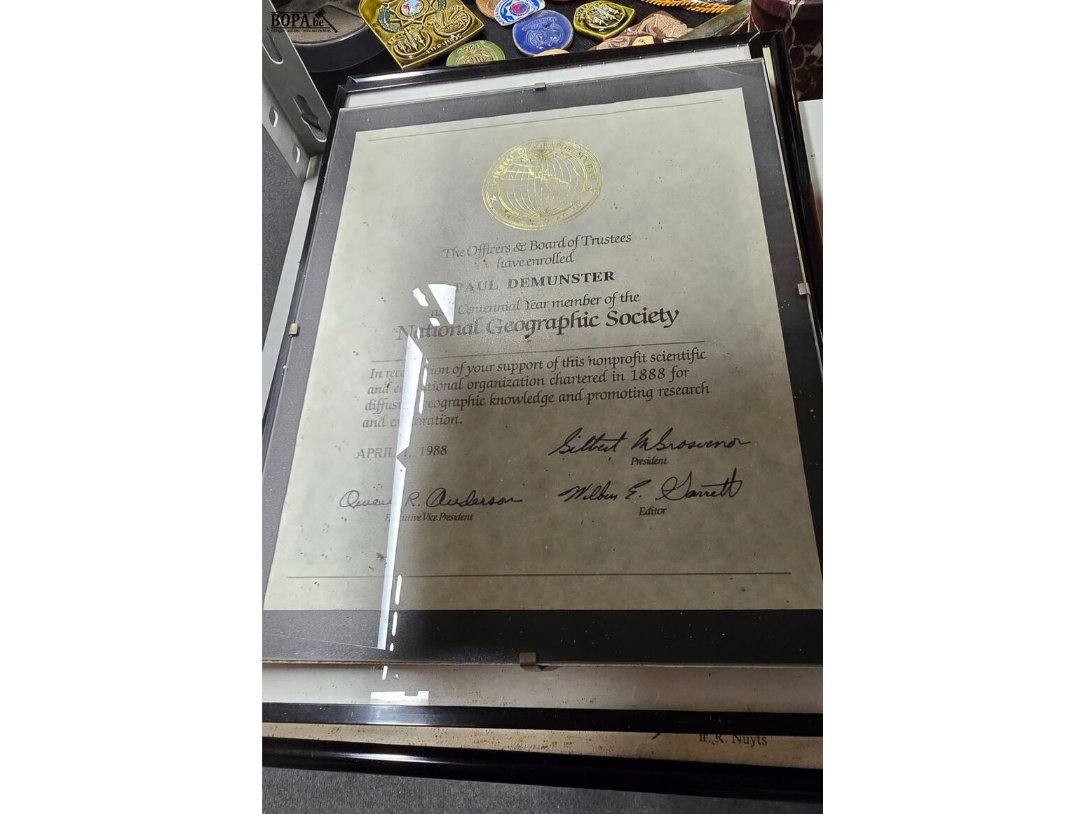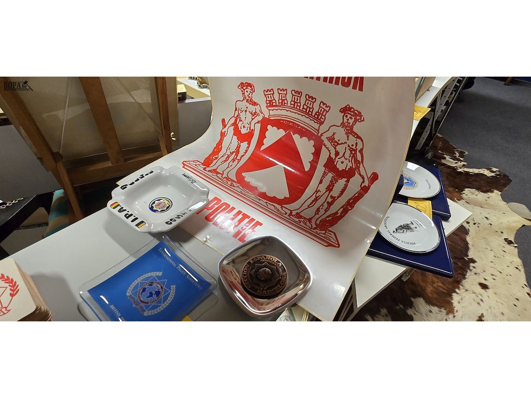 Politie items, grote sticker, 3 x asbak, bierkaarten en 3 getuigschriften