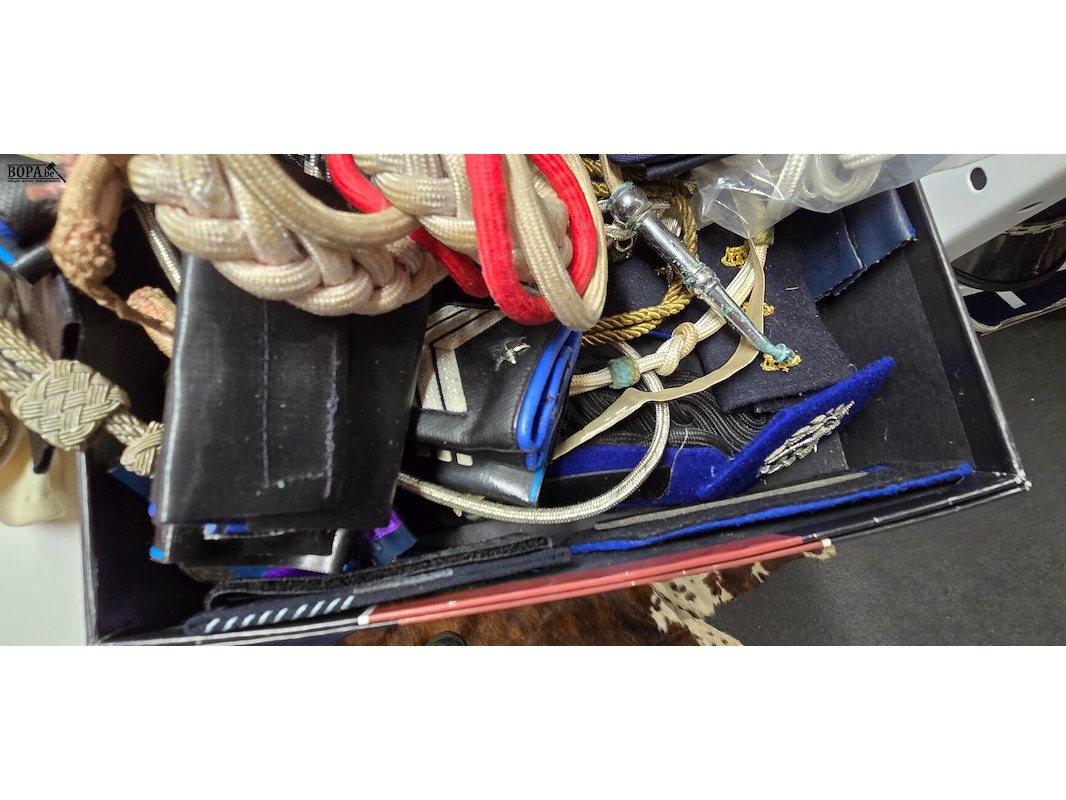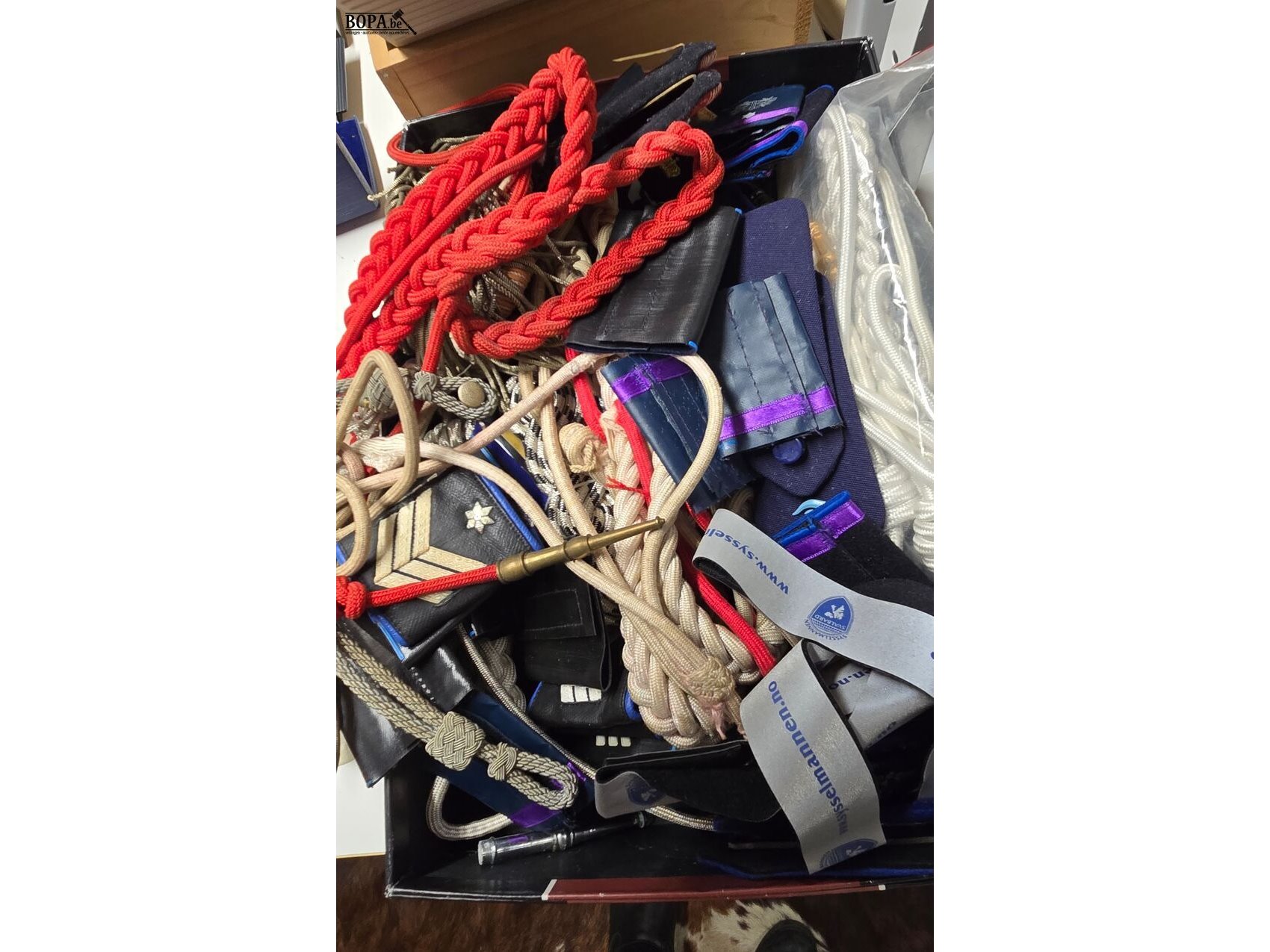 Diverse schouder items van uniformen zoals Fourageres en nestels, epauletten en rangonderscheidingstekend,handschoen….
