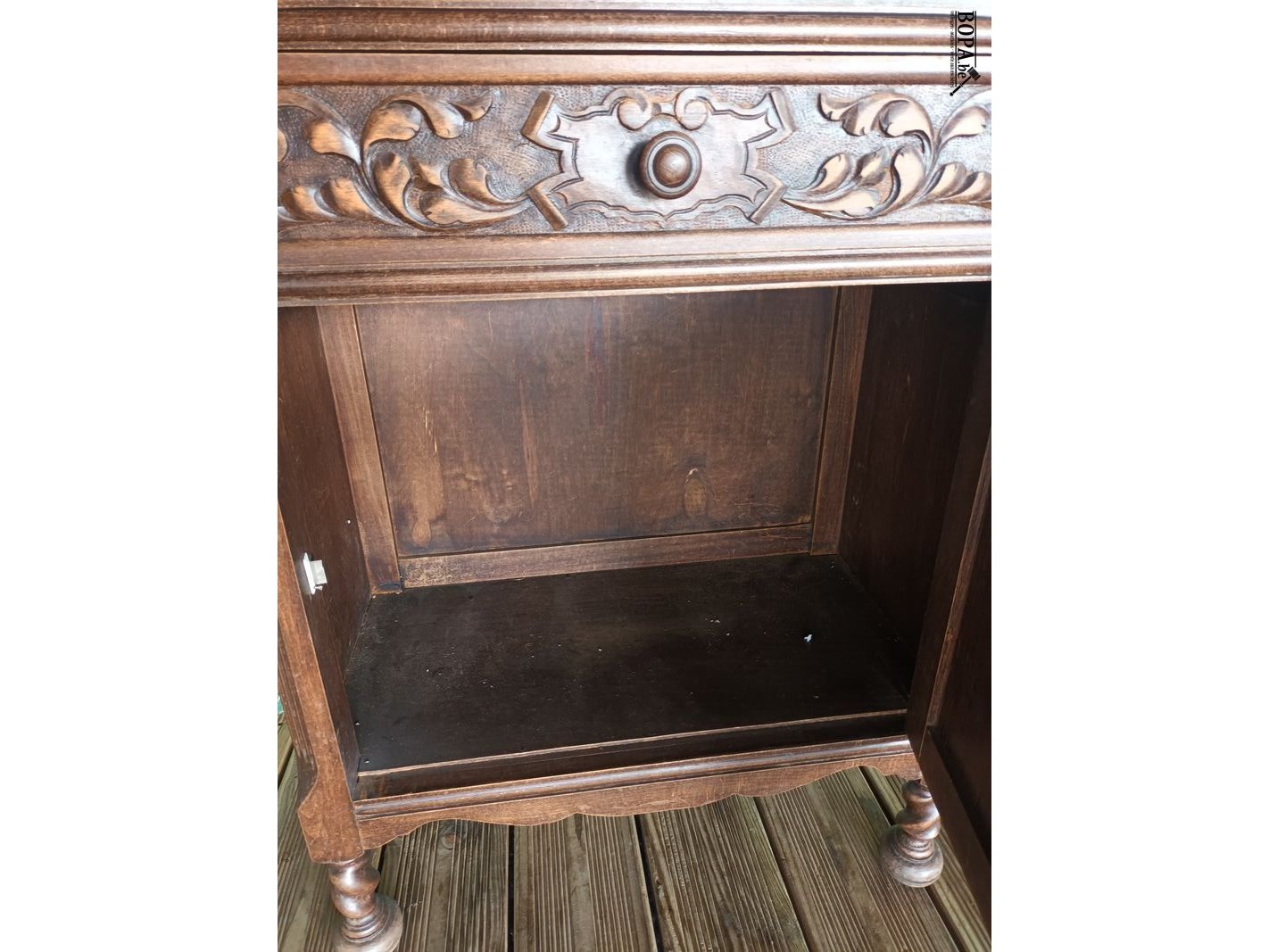 Antieke houten ladekast met 2 lades en 1 deur. 65 x 37 x 95 cm.