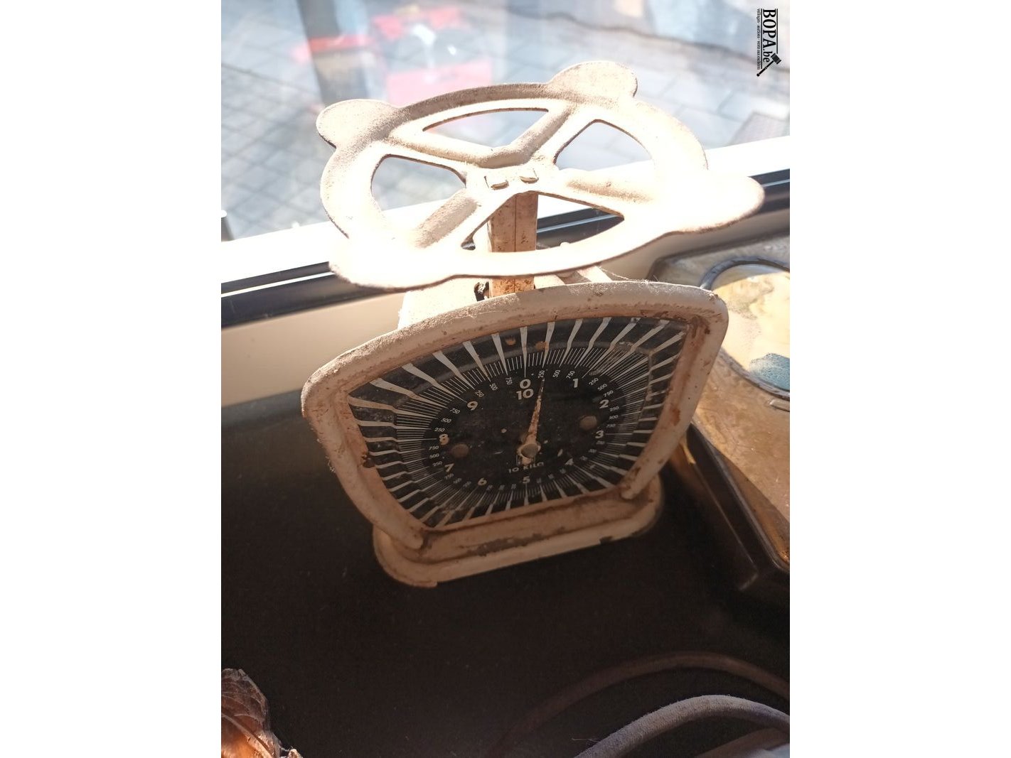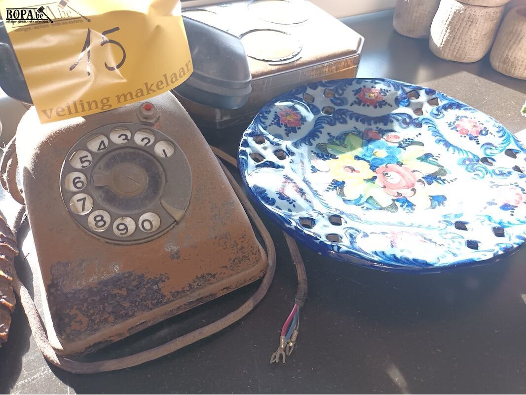 Decoratie. 5 stuks. Antieke telefoon, koperen hertenkop, antieke weegschaal, sierbord en blikken doos.