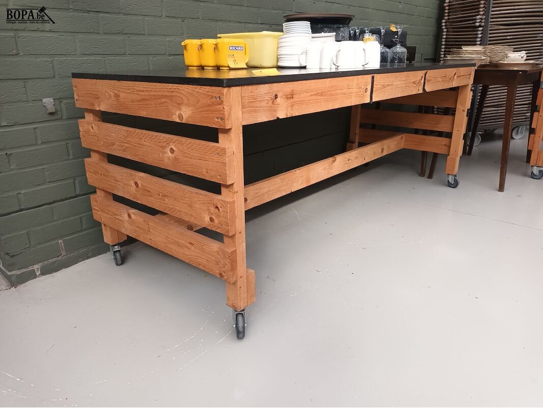 Mobiele houten werktafel. 210 x 80 x 78 cm.