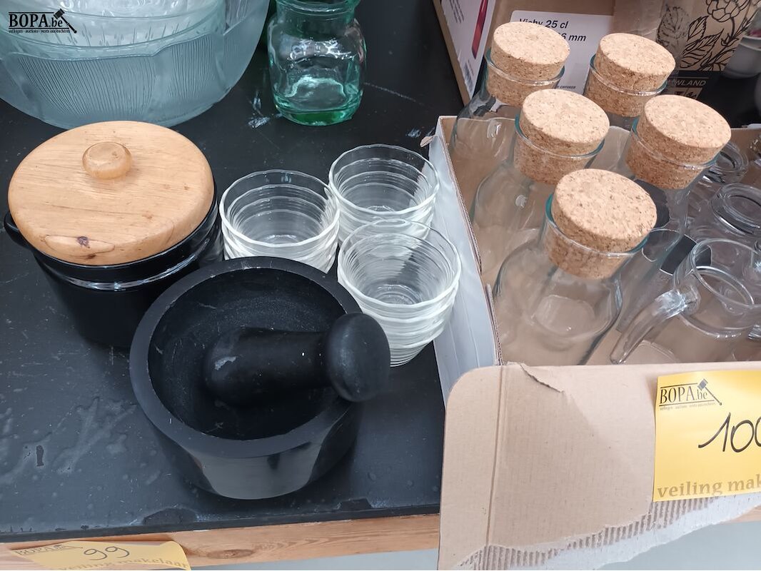 Divers keukengerei zoals een vijzel, glaasjes, bokalen, kleine potjes.