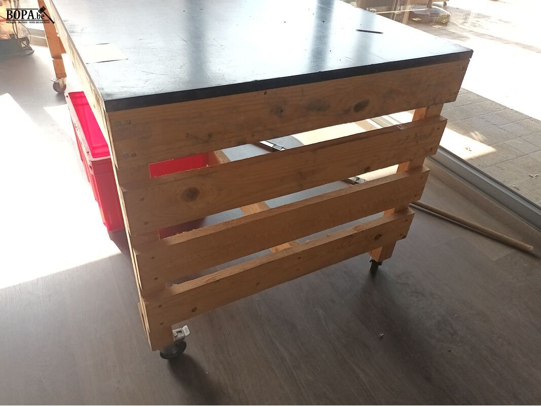 Mobiele houten werktafel. 210 x 80 x 78 cm.