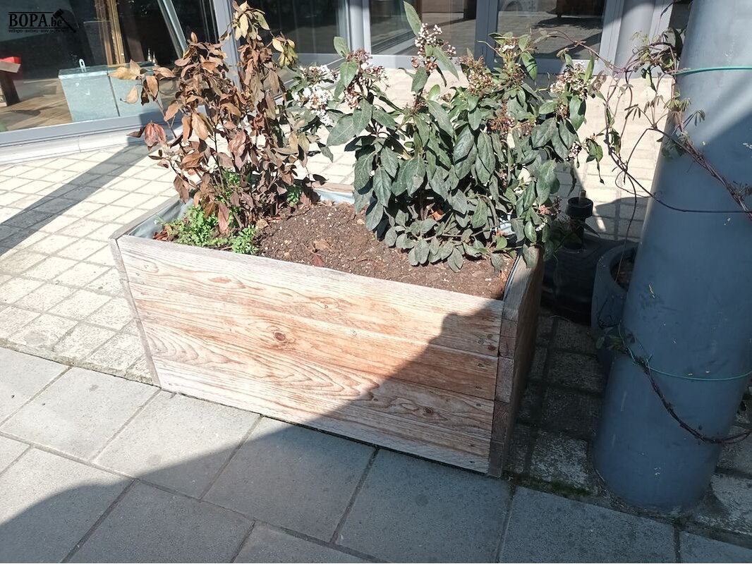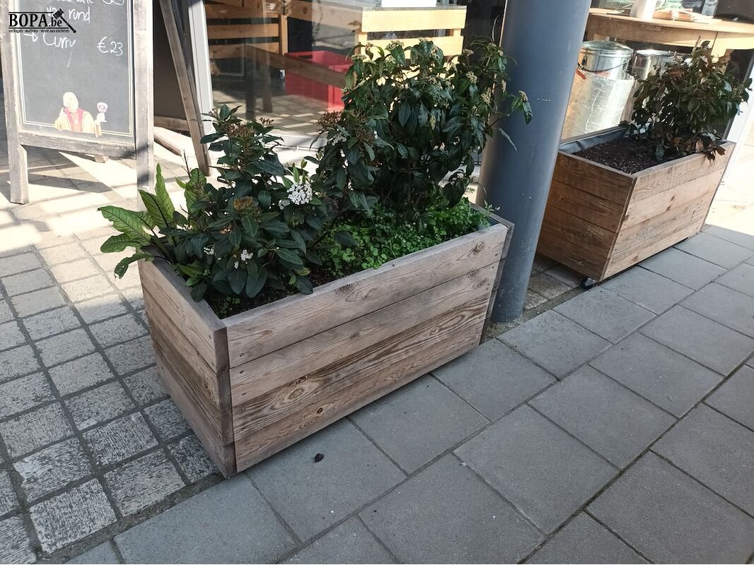 3 houten bloembakken op wielen met planten. 84 x 40 x 47 cm.