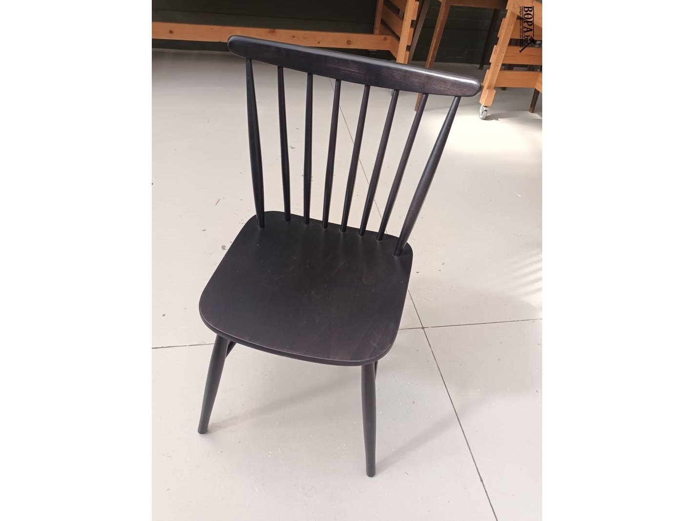 Zwarte houten spijlenstoel. 10 stuks.