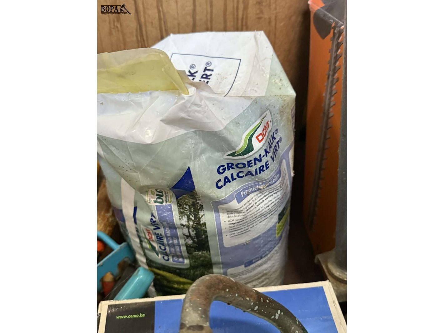 Lot tuinmateriaal : herbruikbare afvalzakken 3stuks - box tuinmateriaal circa 12 stuks - groene kalk 2stuks + ziewierkalk nieuw