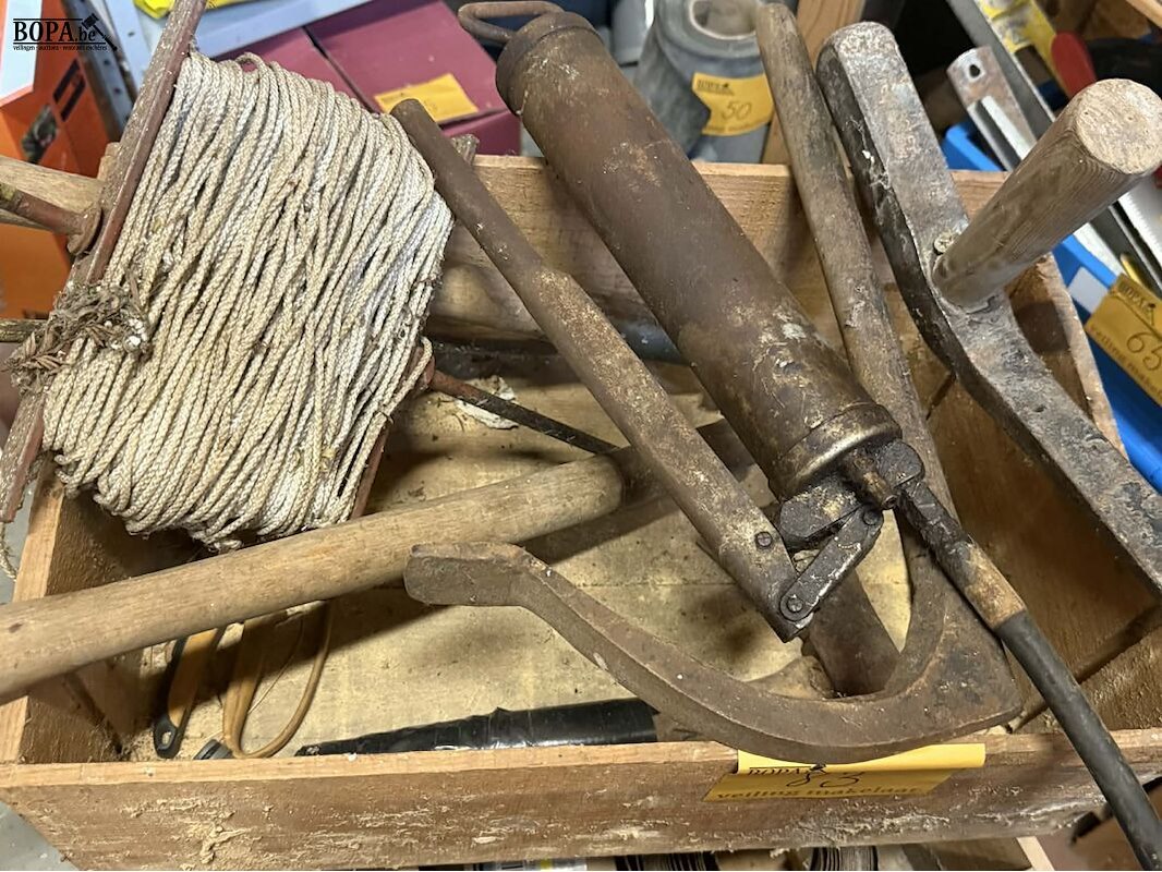 Lot 83 - assortiment gereedschap: tegelhamer, haspel waslijn 7 stuks