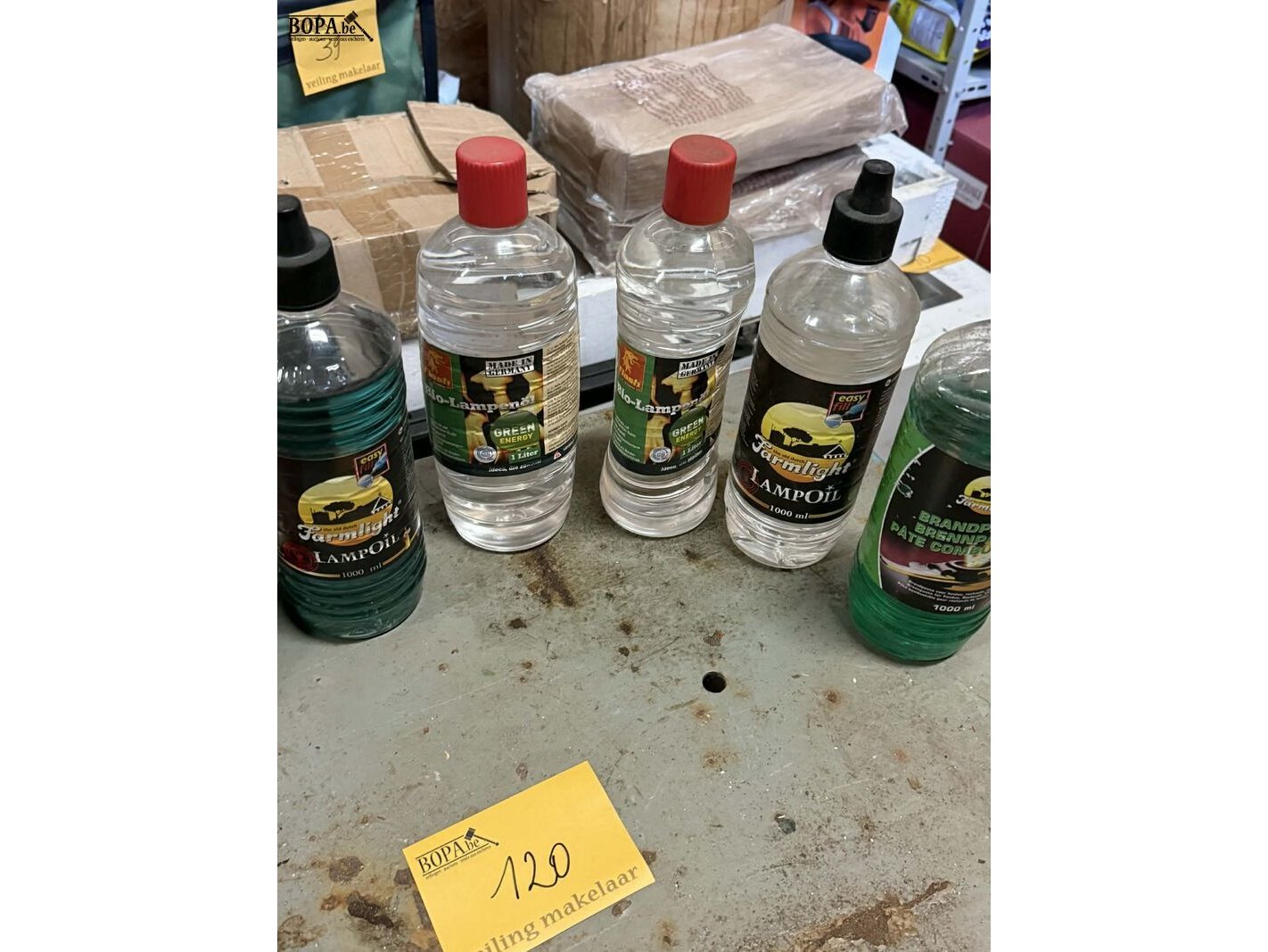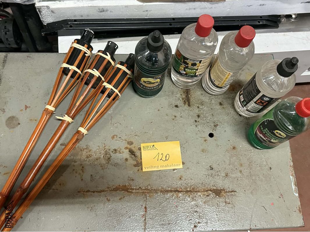 Lot 120 - fakkels 3 stuks + lampenolie en pasta 5 flessen