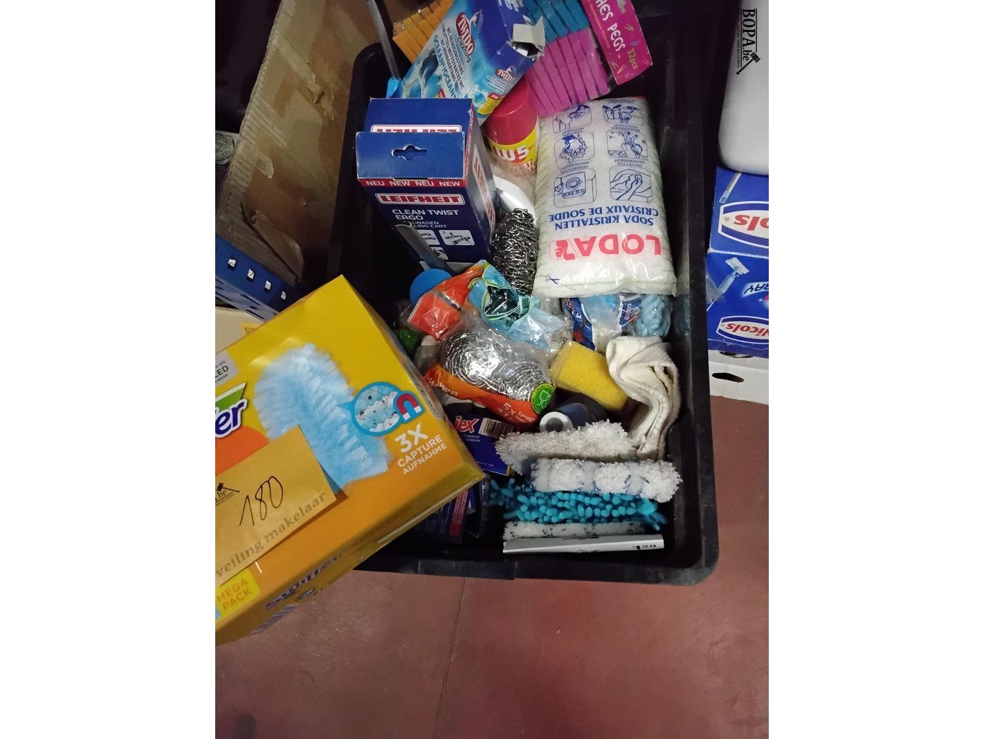 Lot 180 - box hulpmiddelen en producten schoonmaak: doeken, sponzen, s