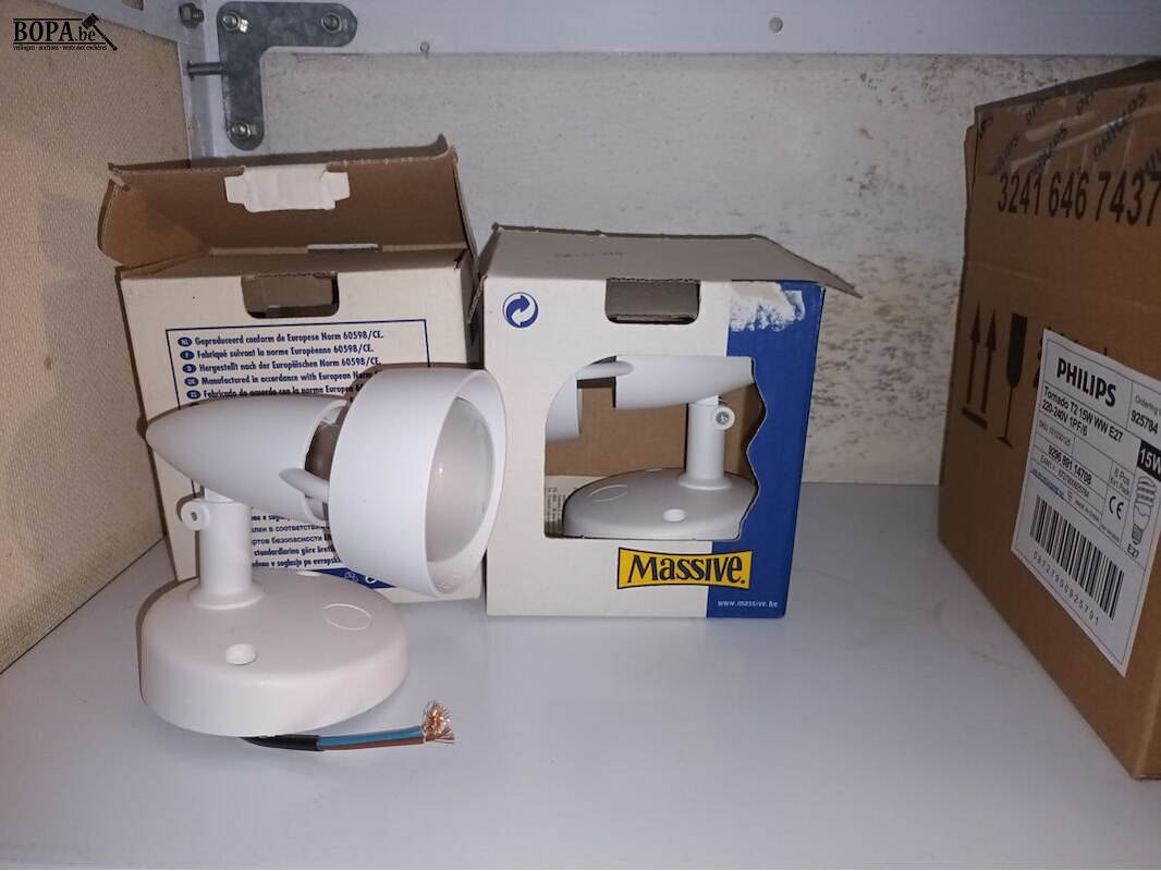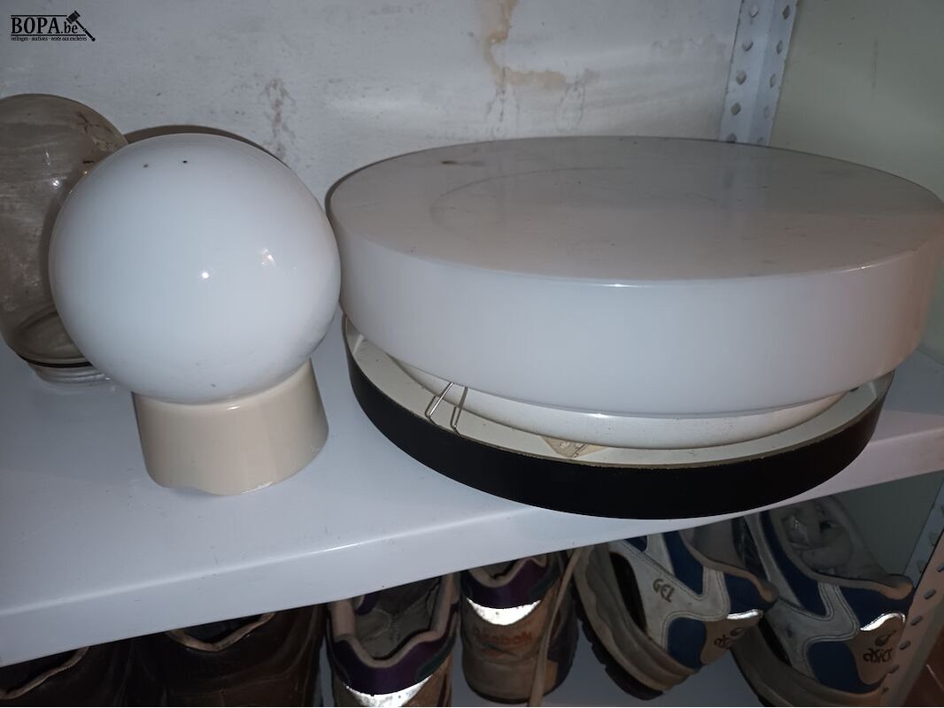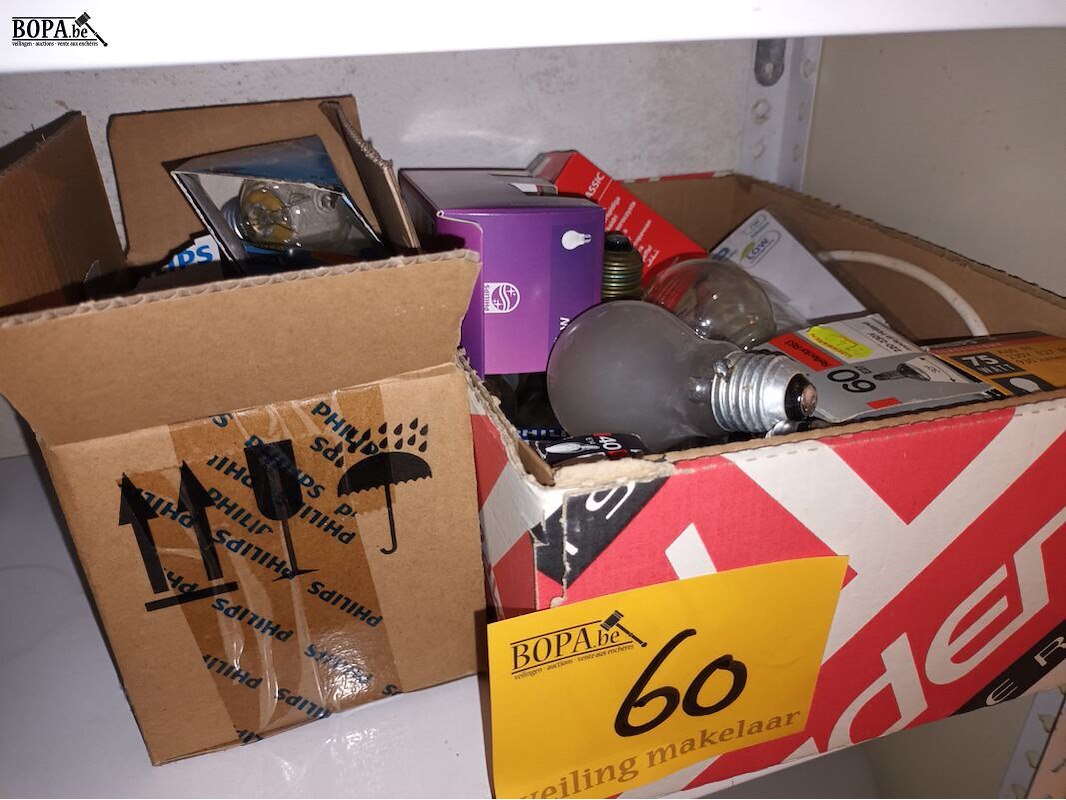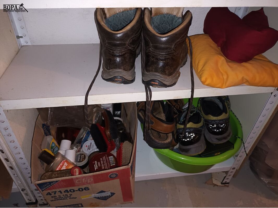 Verlichting, lampen, schoenpoetsmateriaal en schoenen. Inhoud rek.