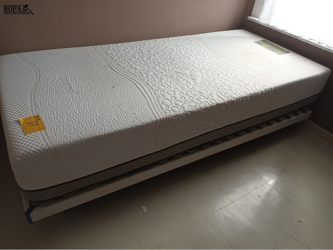 Eenpersoonsbed met matras en lattenbodem. 90 x 200 cm.