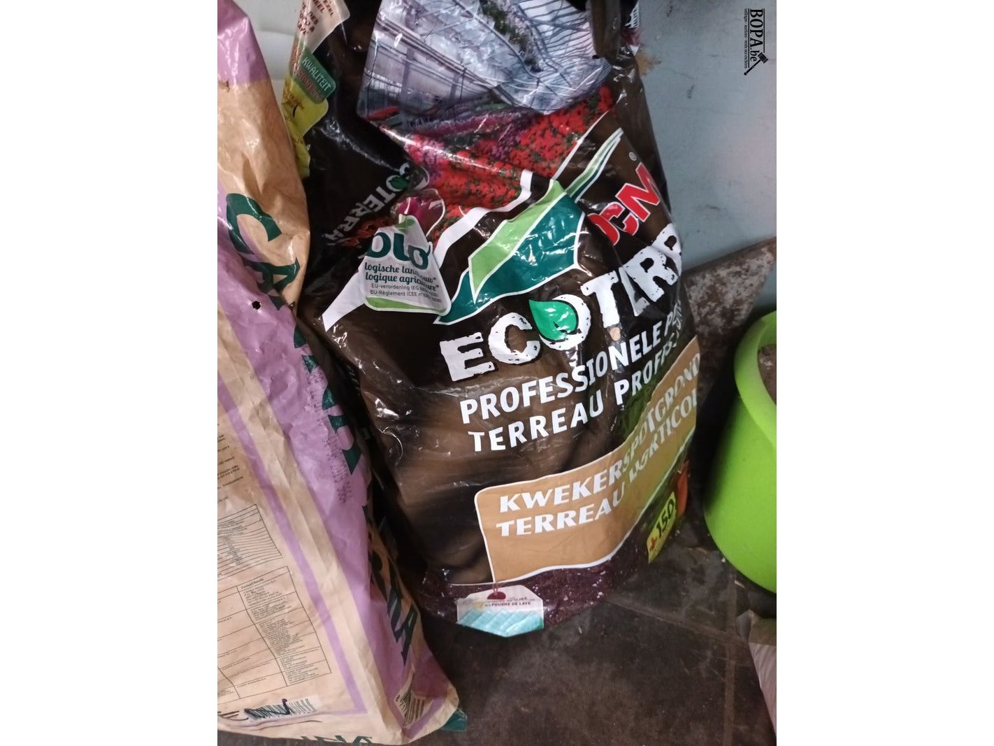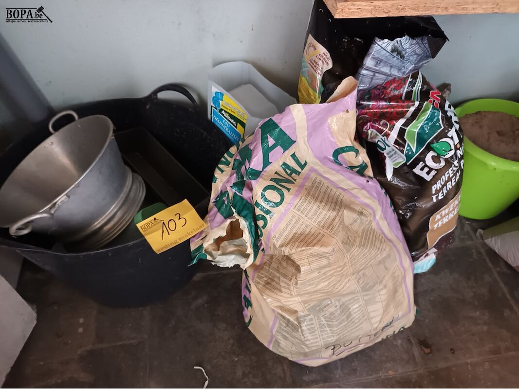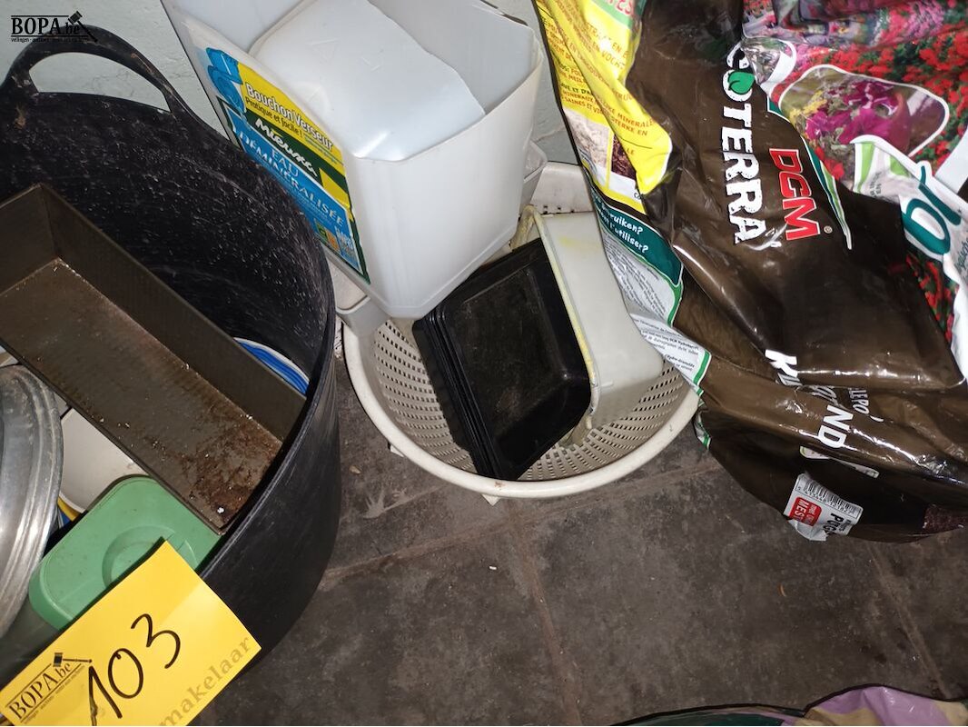 2 zakken met plastieken potten, 1 plastieken kuip en aluminium zeef.