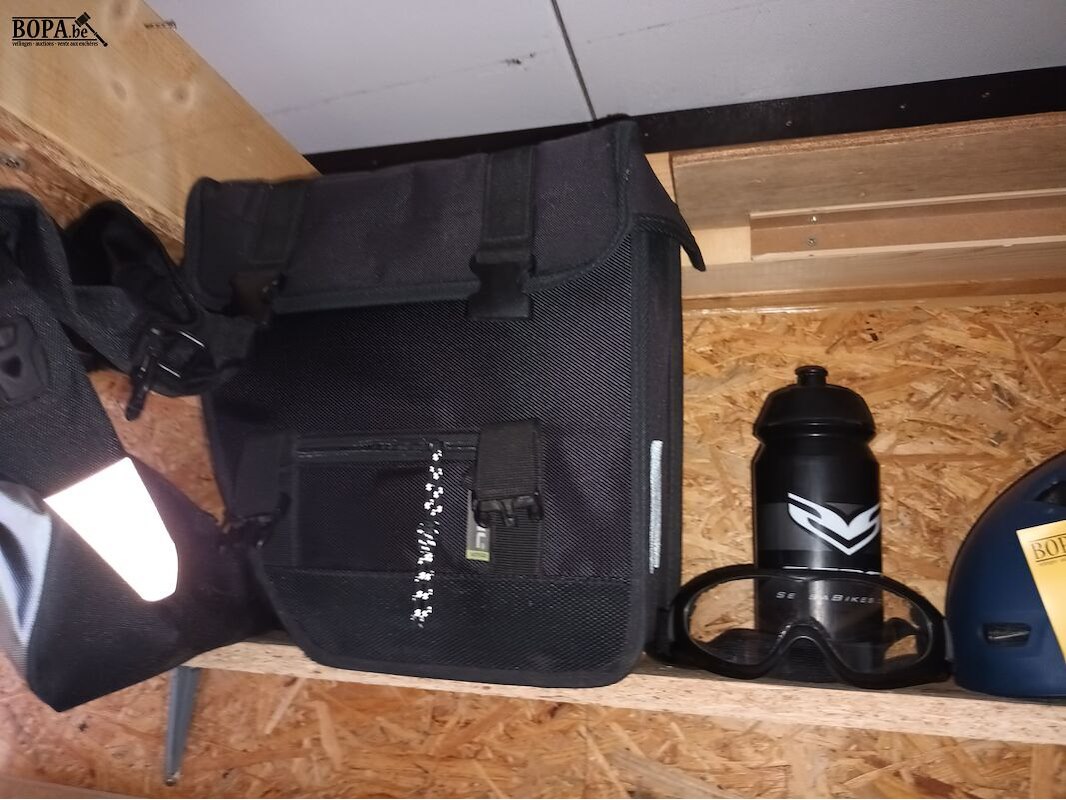 Fietsbenodigdheden. 11 stuks. Fietstassen, fietshelm, binnenbanden, brillen, slot.