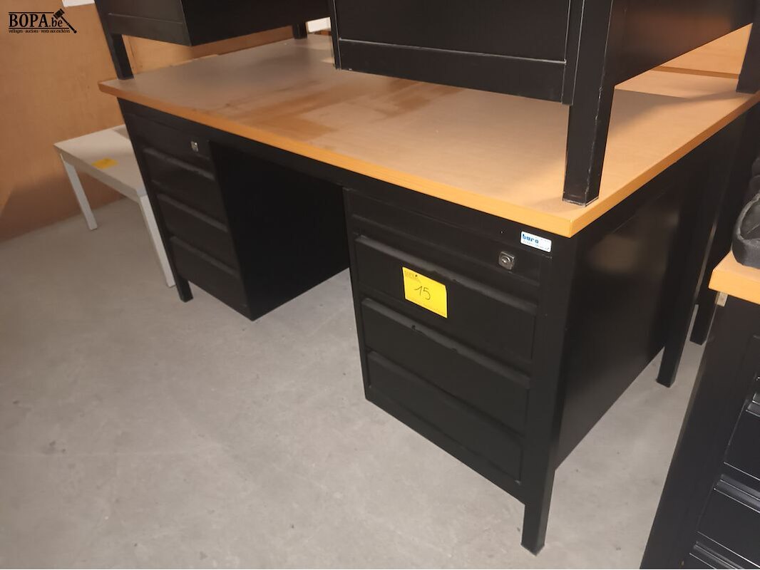 Bureau in zwart metaal met houtlook bovenblad. 150 x 80 x 77 cm.