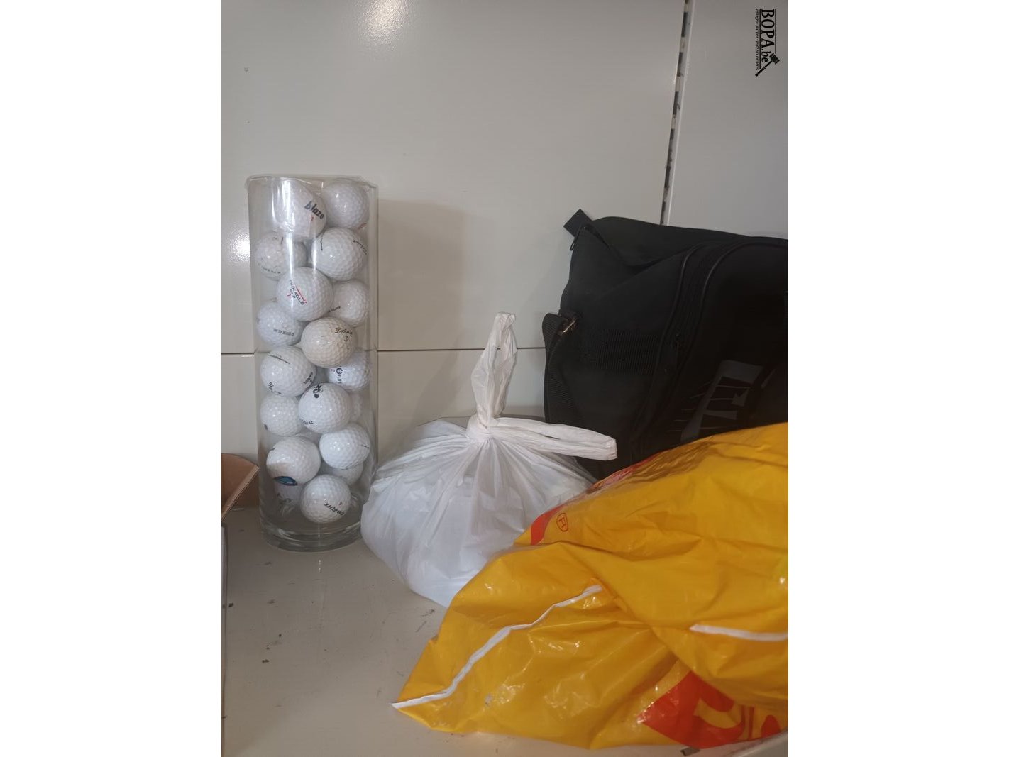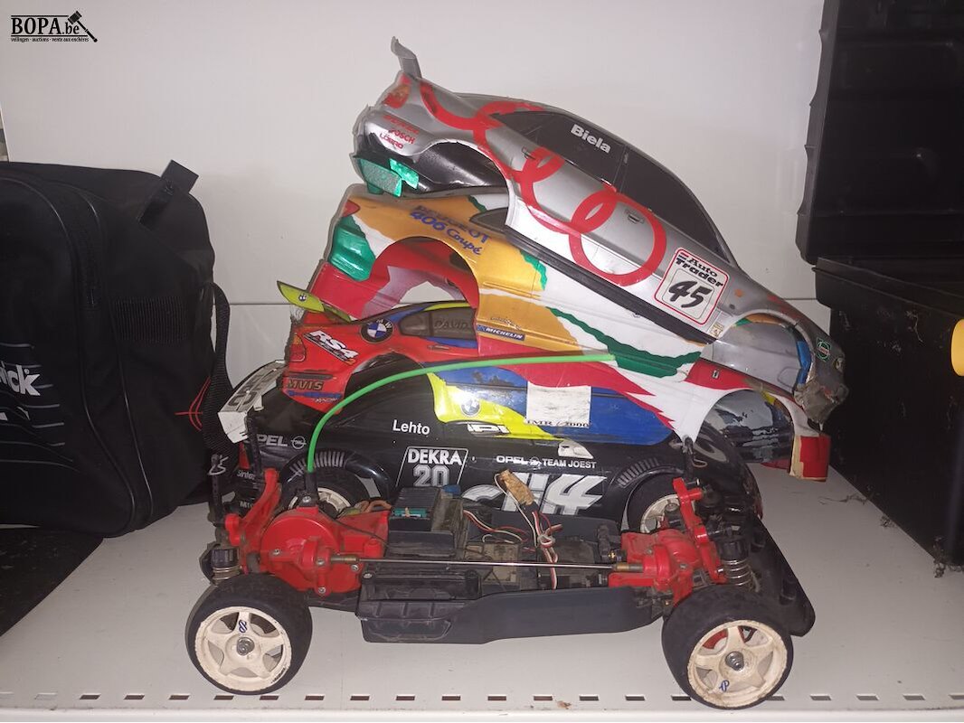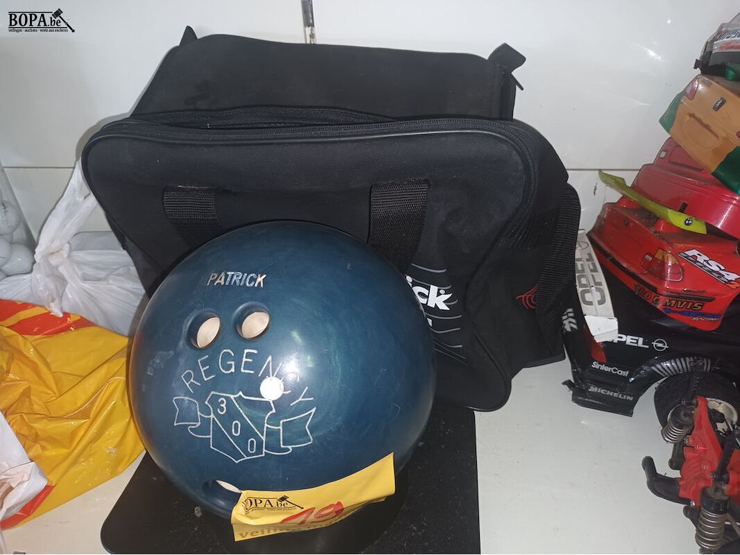 Race auto met diverse skins, bowlingbal in draagtas en een lot golfballetjes.