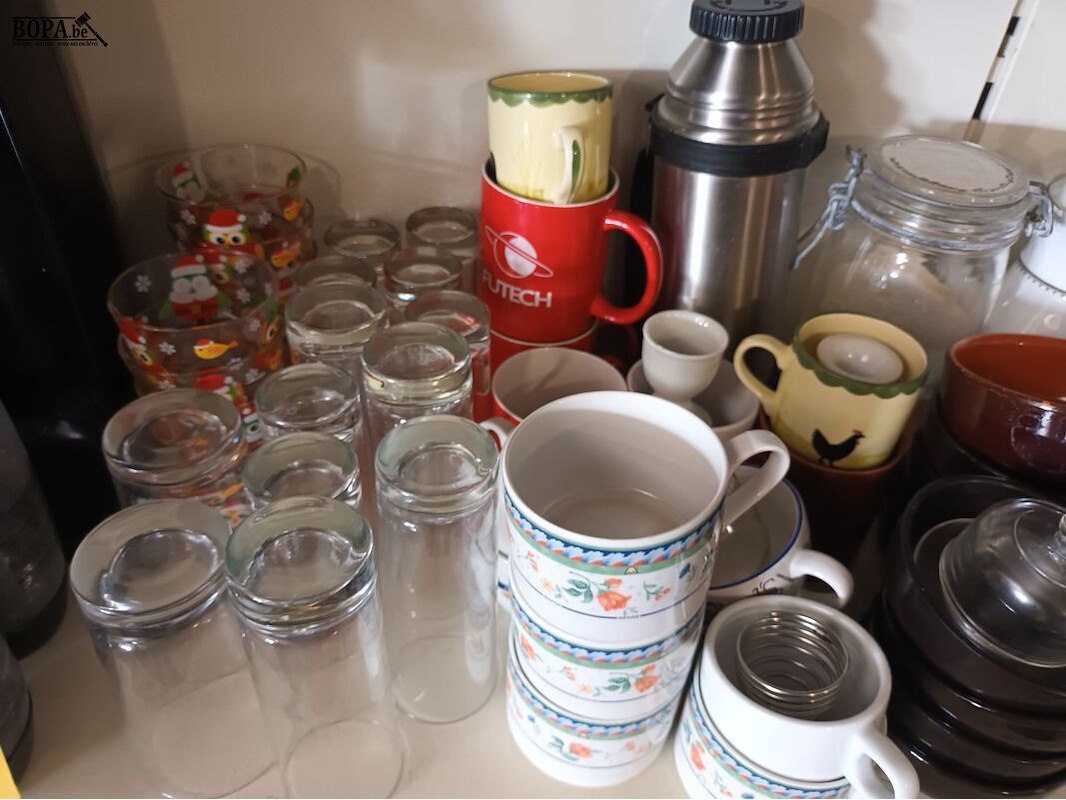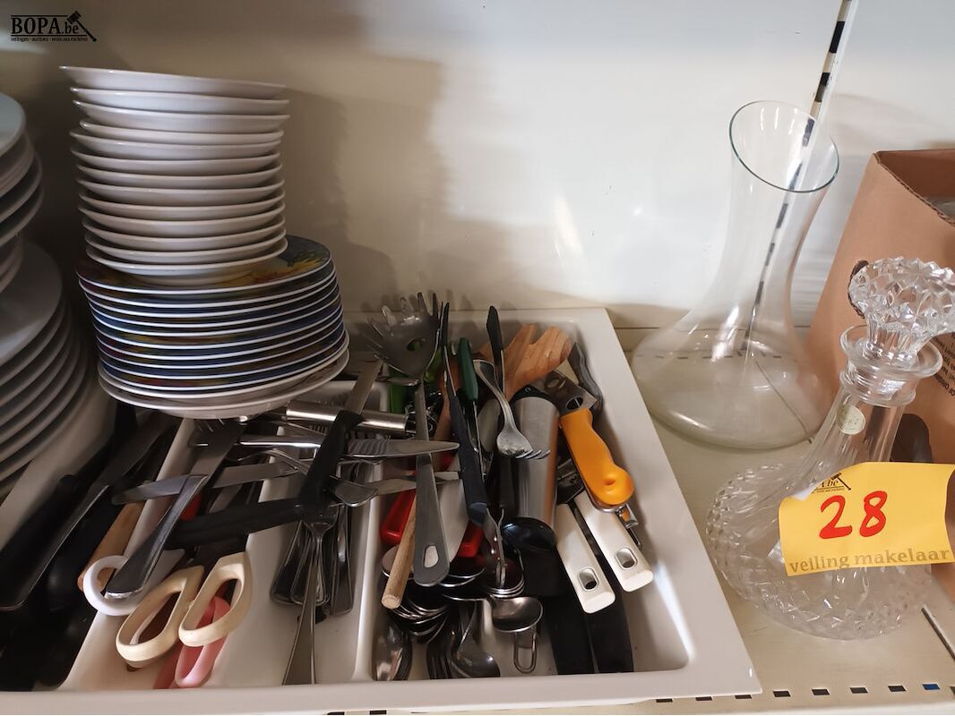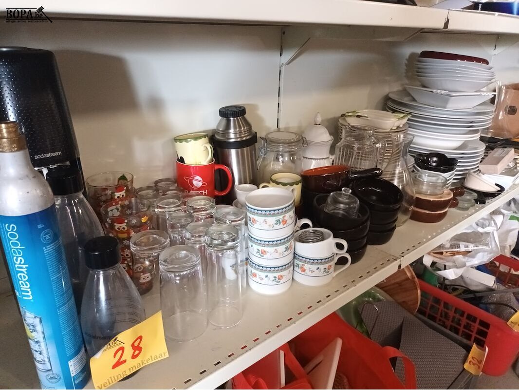 Lot keukengerei zoals Soda stream toestel, glazen, tassen, borden, bestek en karaffen.