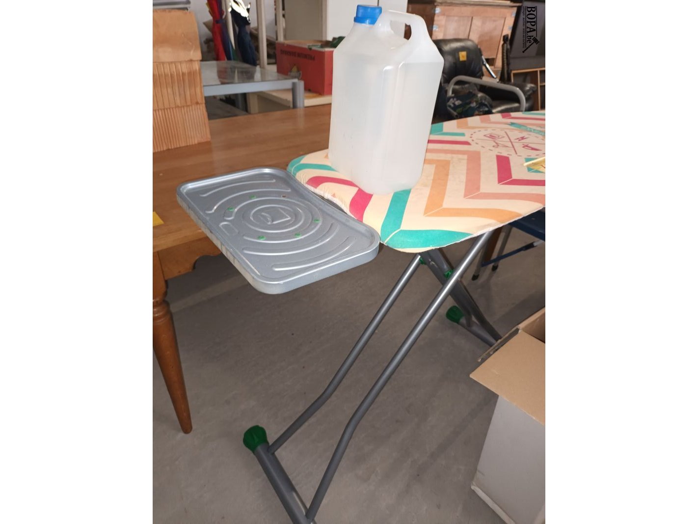 Strijkplank + bidon gedemineraliseerd water.