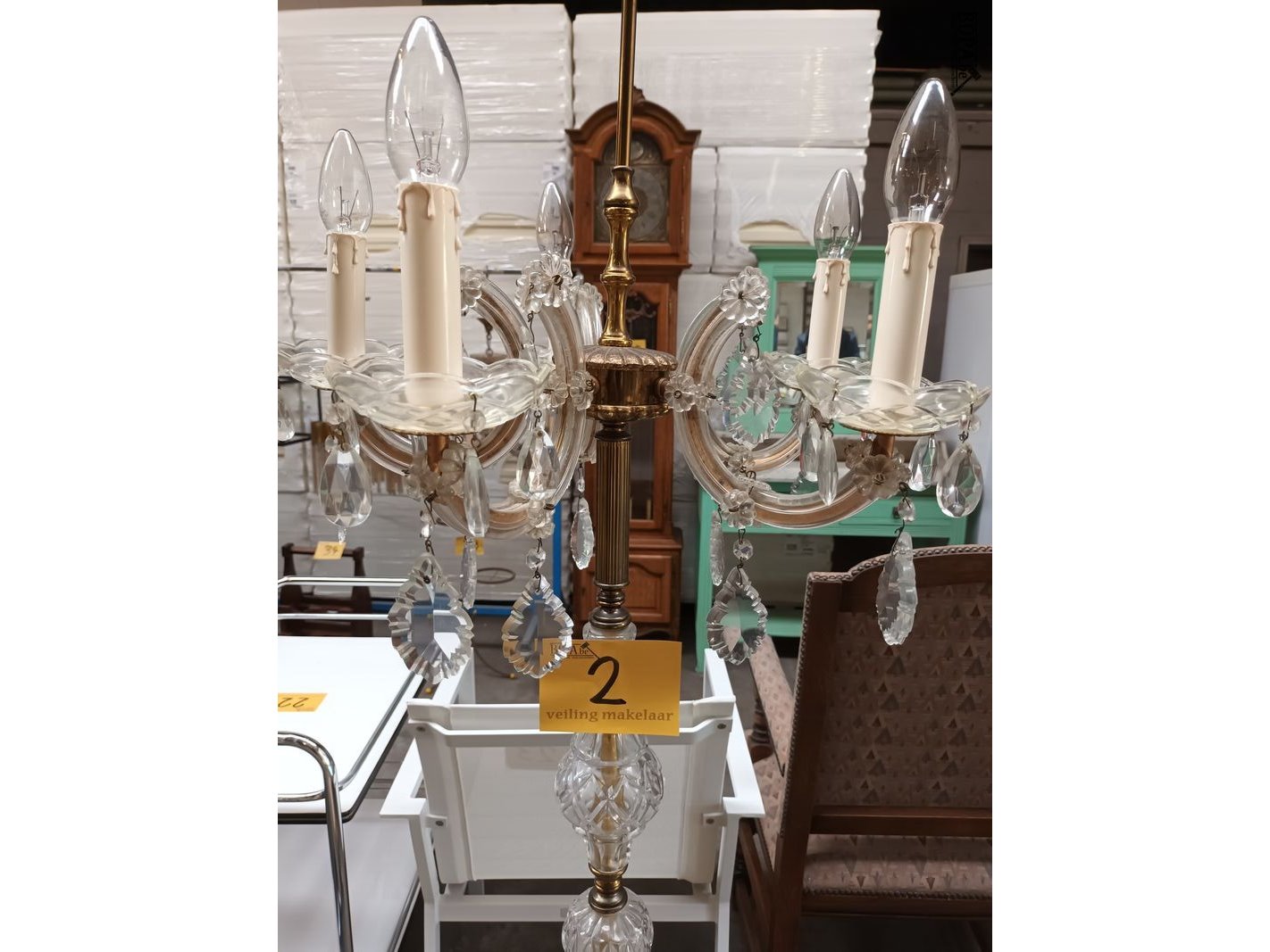Staande lamp met koper en glas. Hoogte 174 cm.