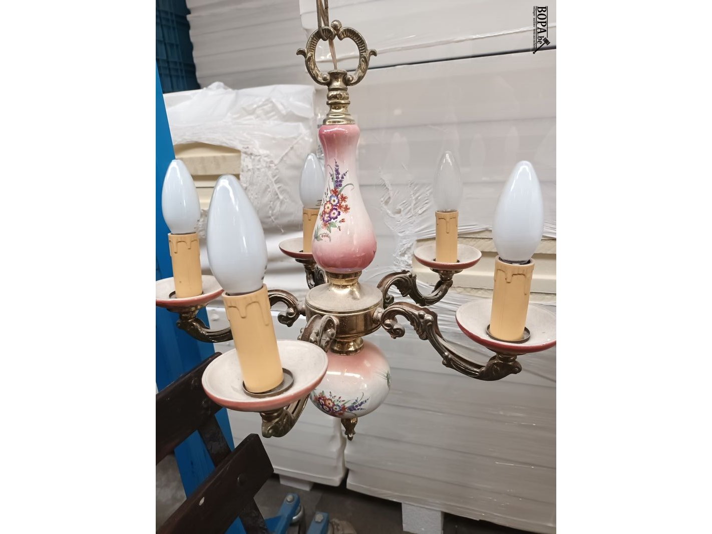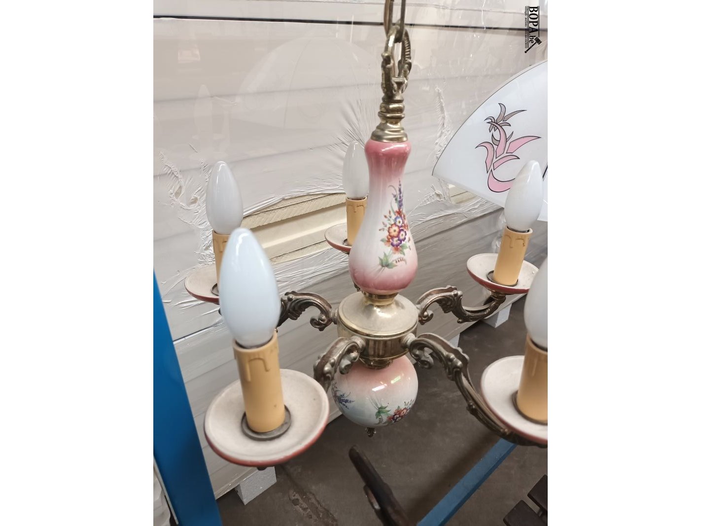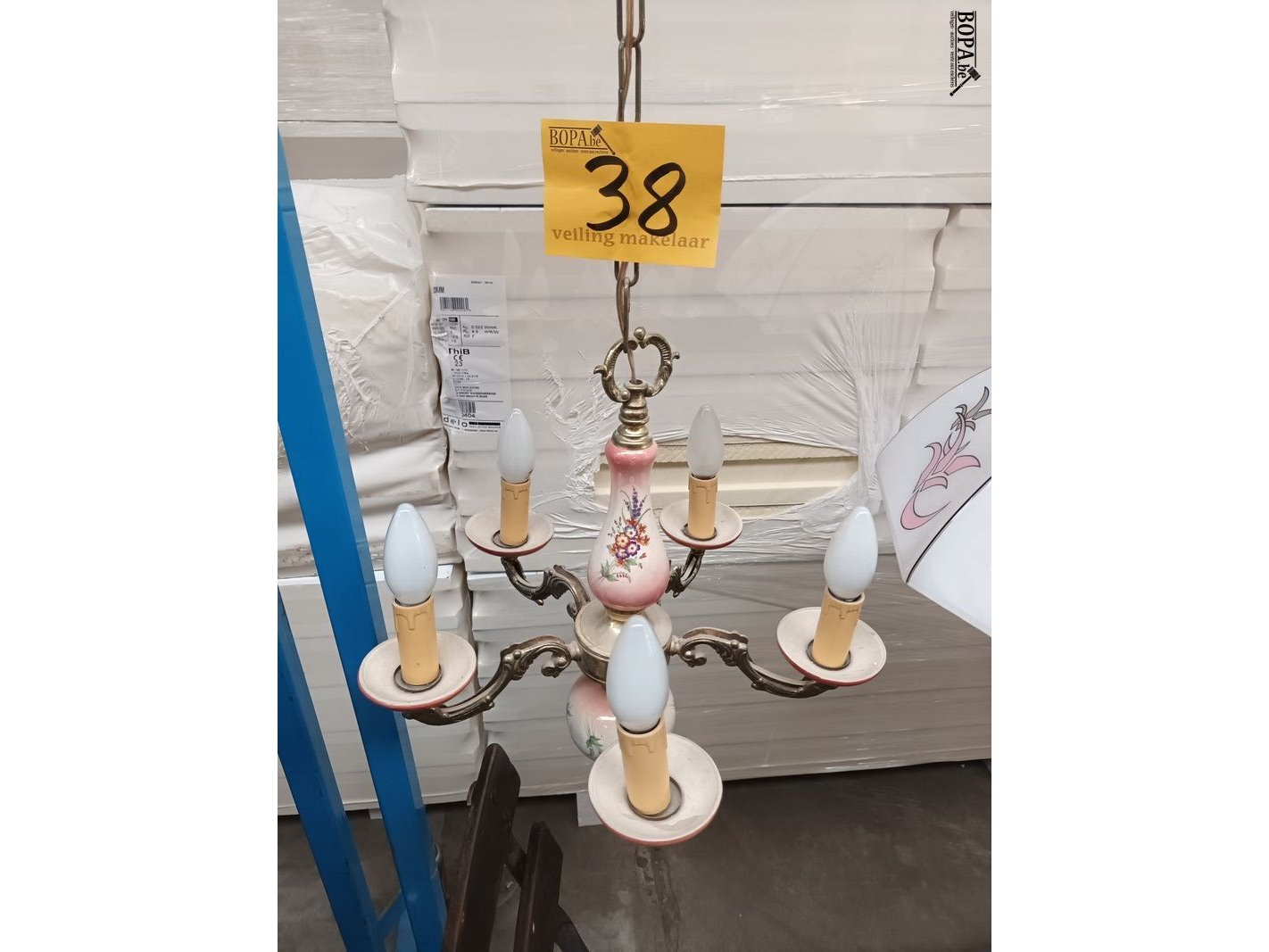 Luster in porselein. Diameter 39 cm. Hoogte 79 cm.