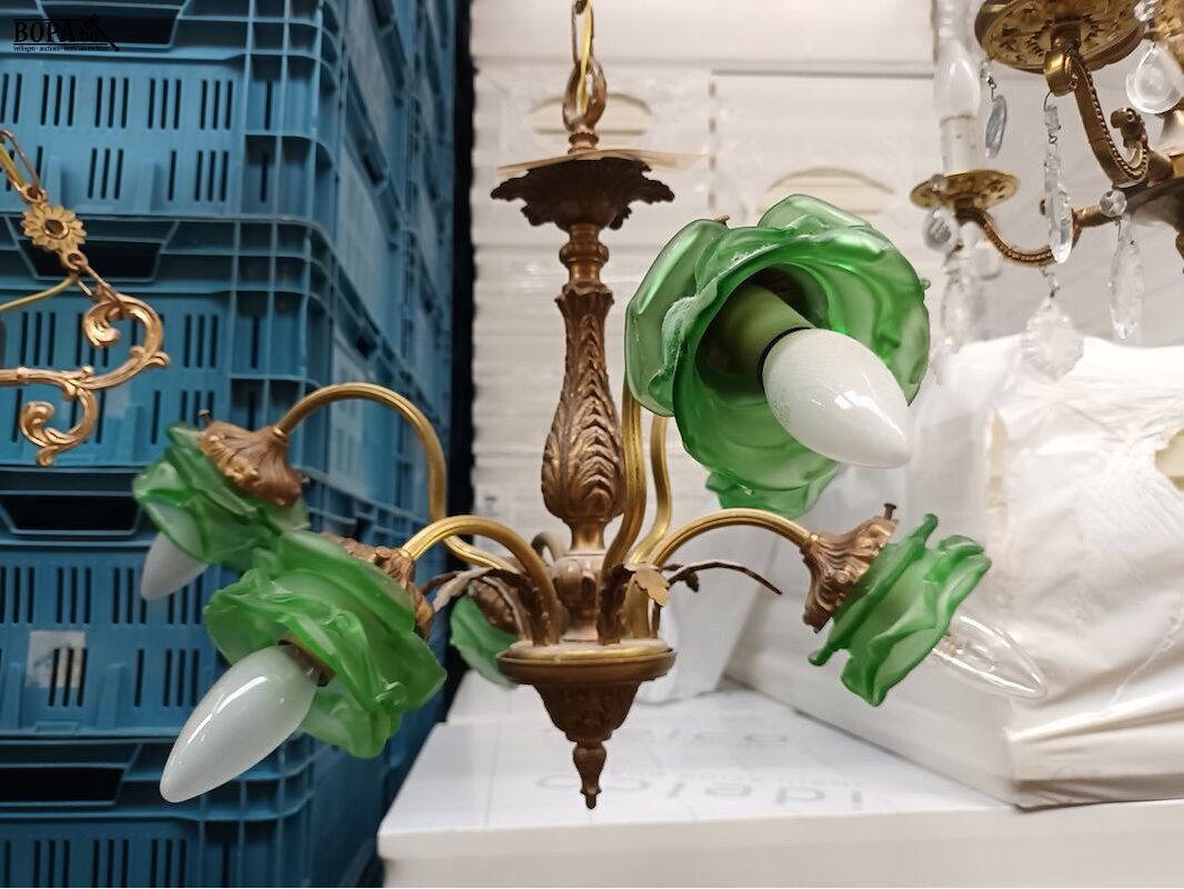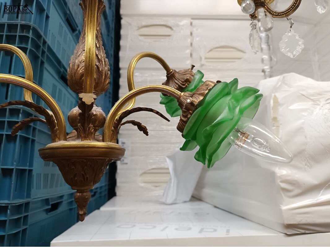 Luster in koper met groene lampenkapjes. Diameter 48 cm. Hoogte 78 cm.