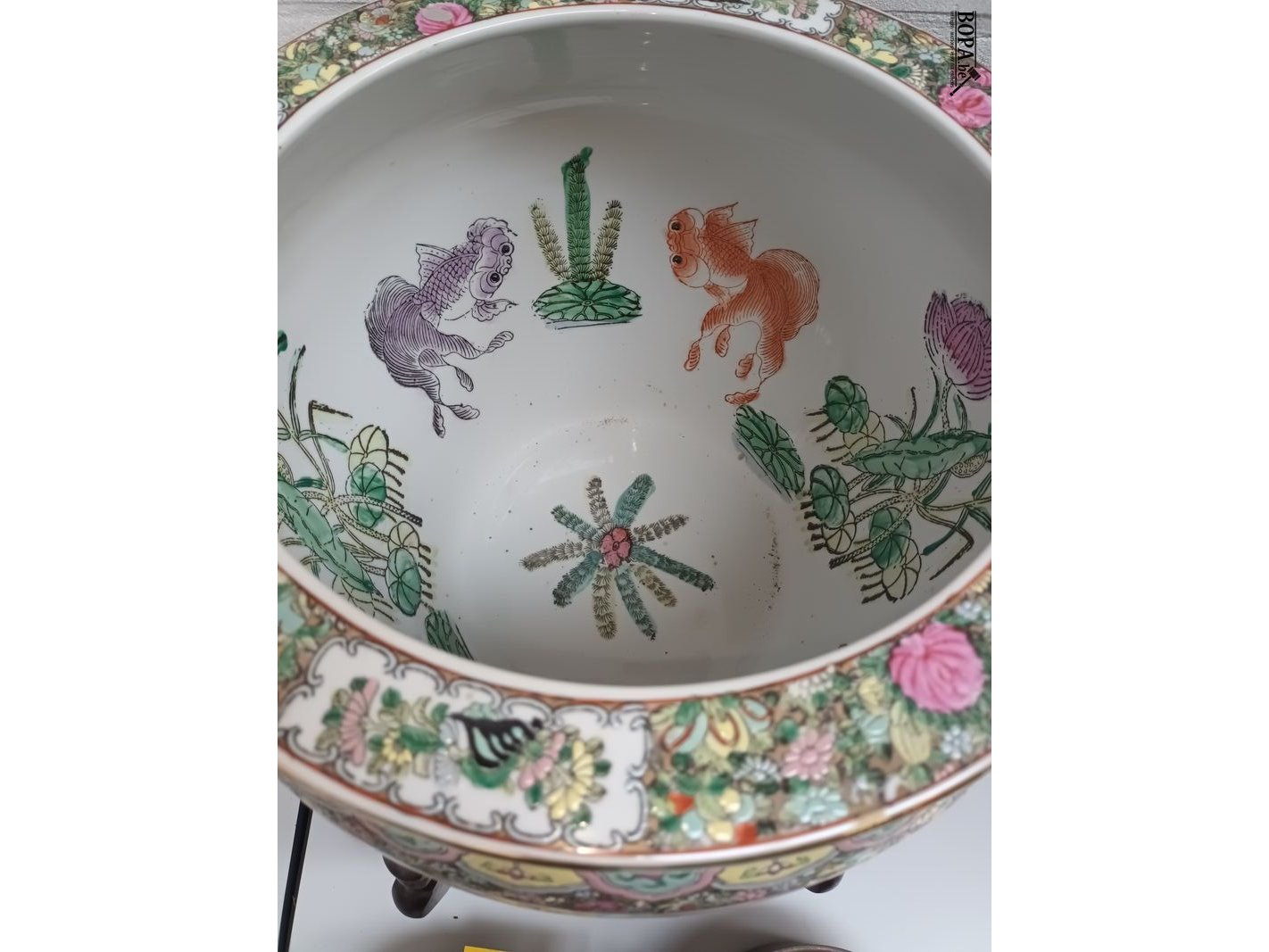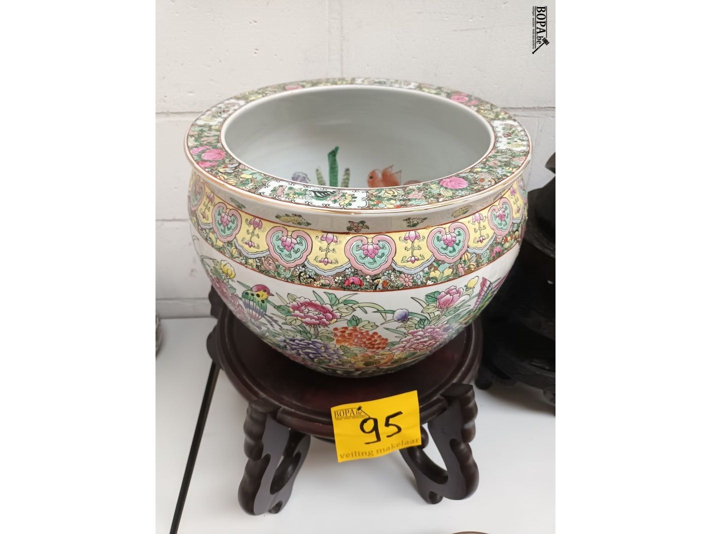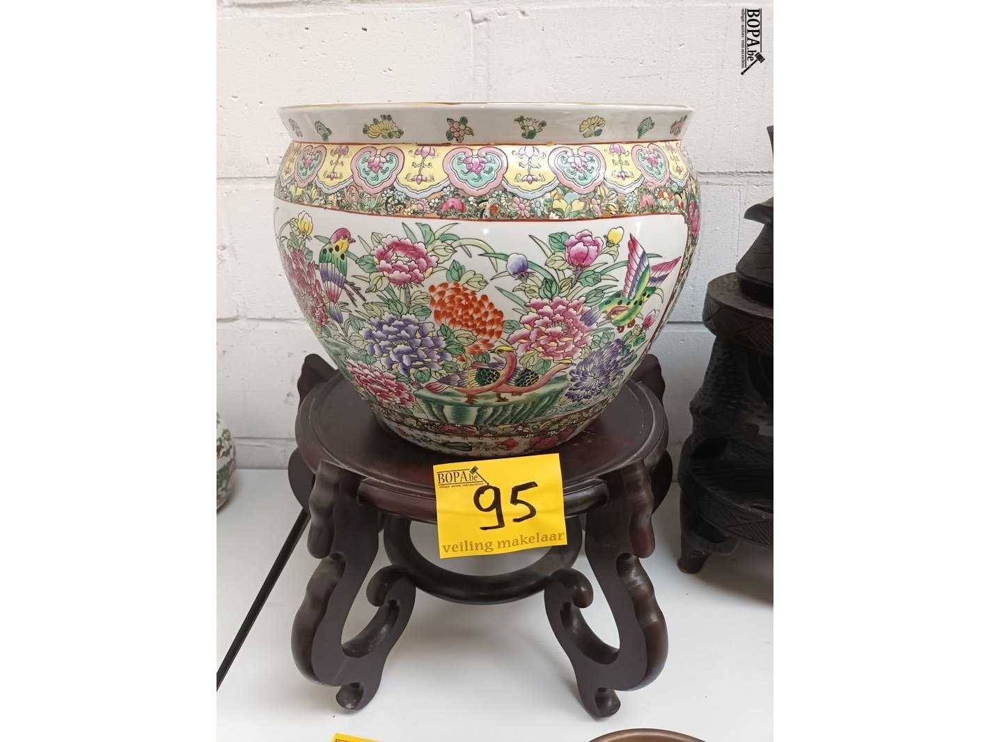 Chinese bloempot op houten sokkel. Hoogte 58 cm.