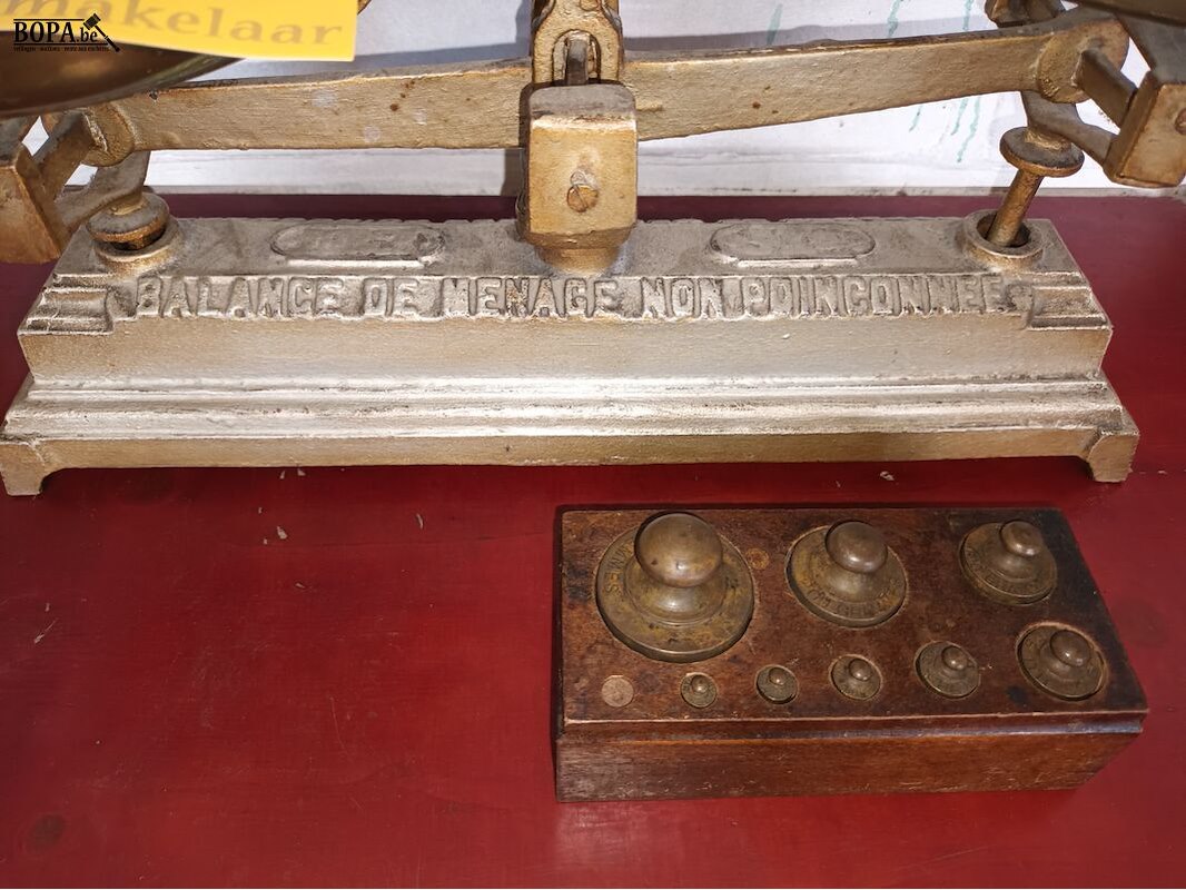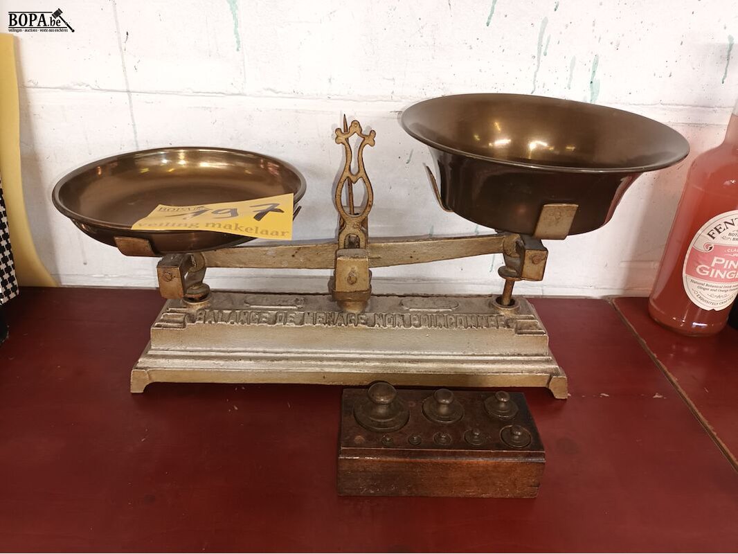 Antieke weegschaal en gewichten.