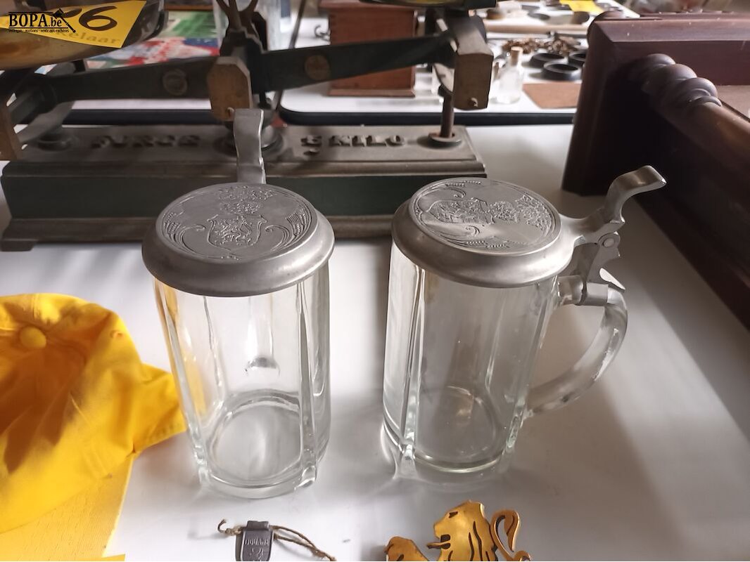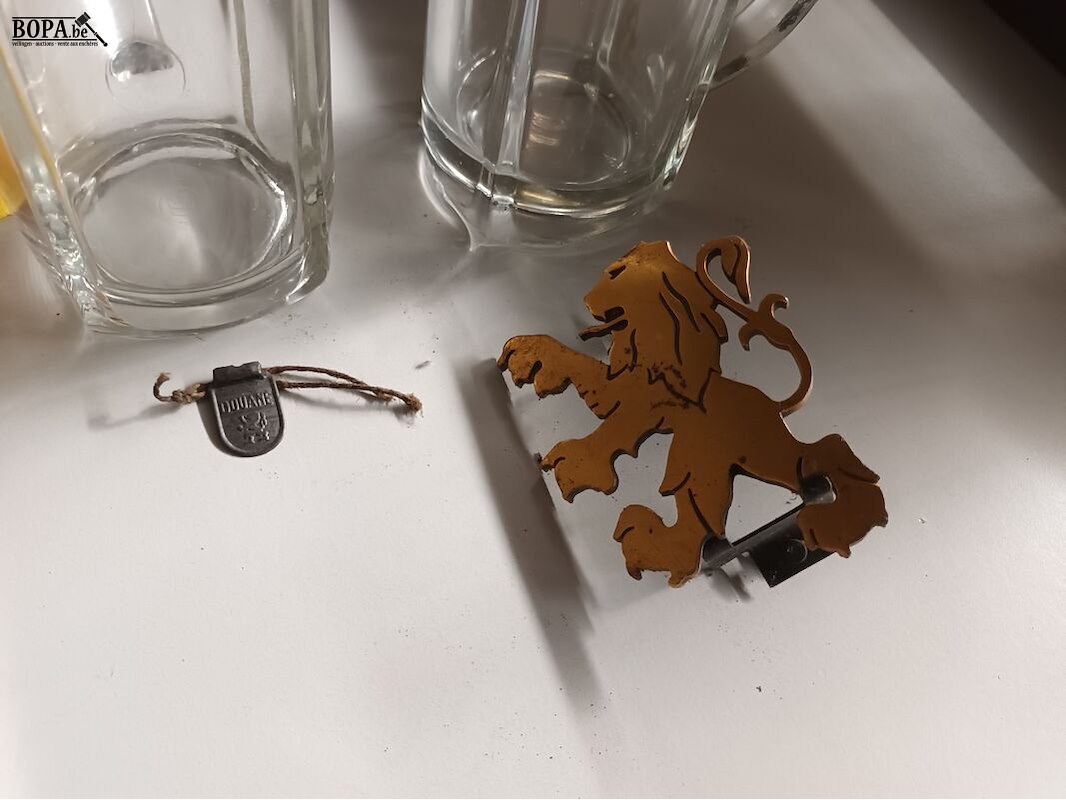 Vlaamse memorabilia. Pet, douanebel, muurplaque, 2 bierpotten.
