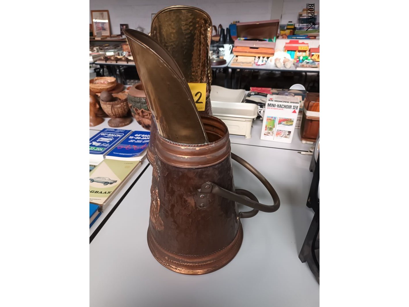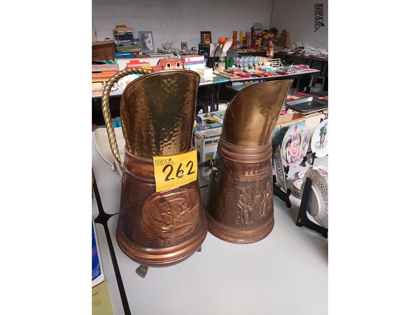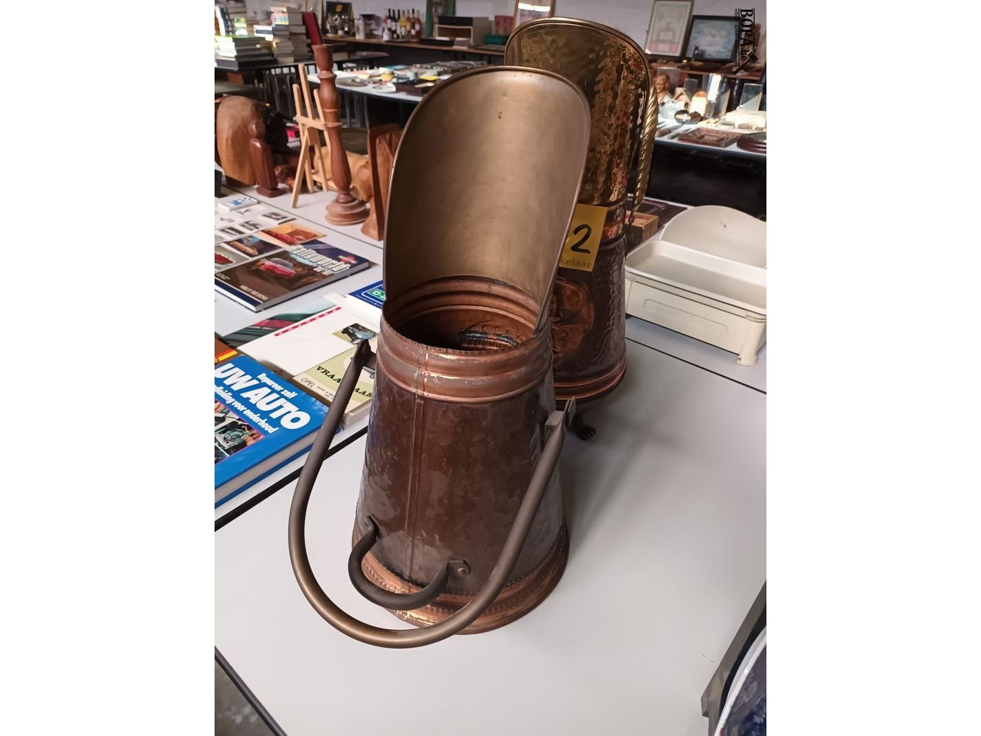 Koperen kolenemmer. 2 stuks. Hoogte 52 cm en 49 cm.
