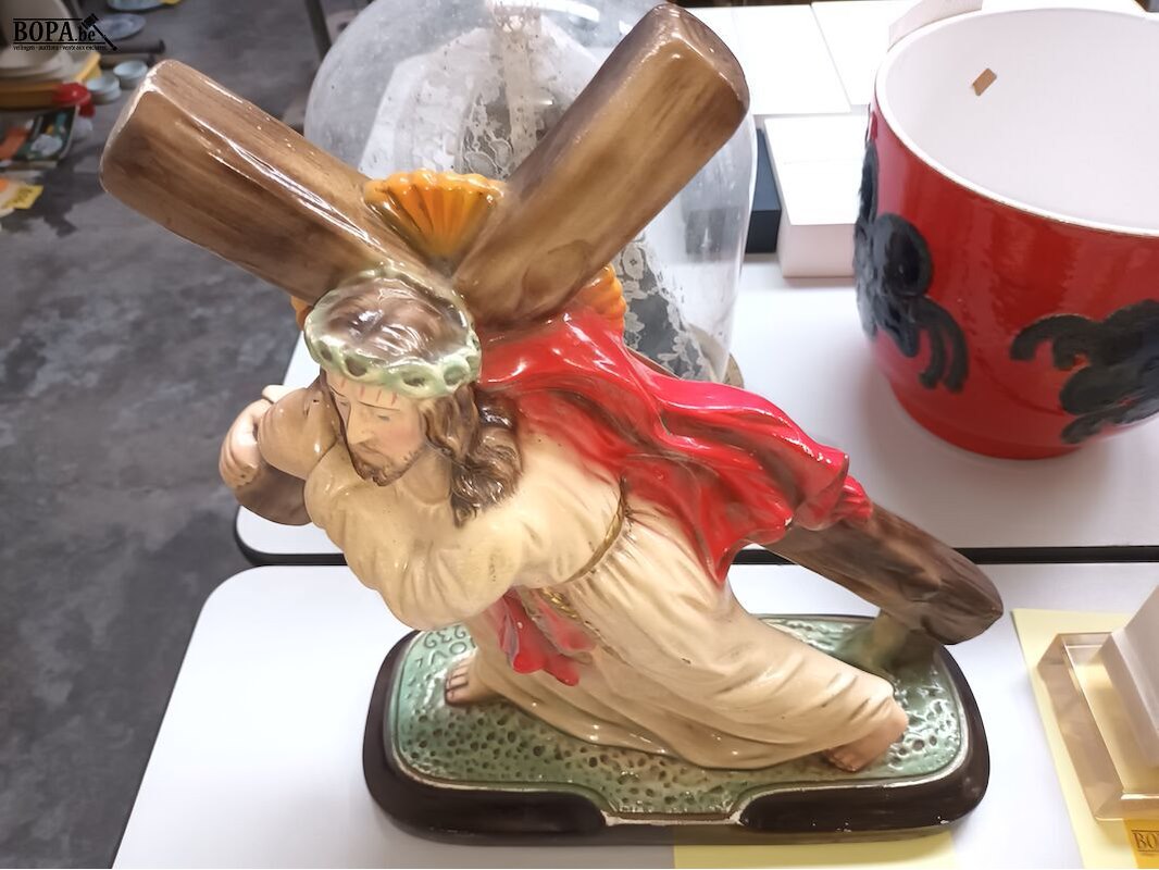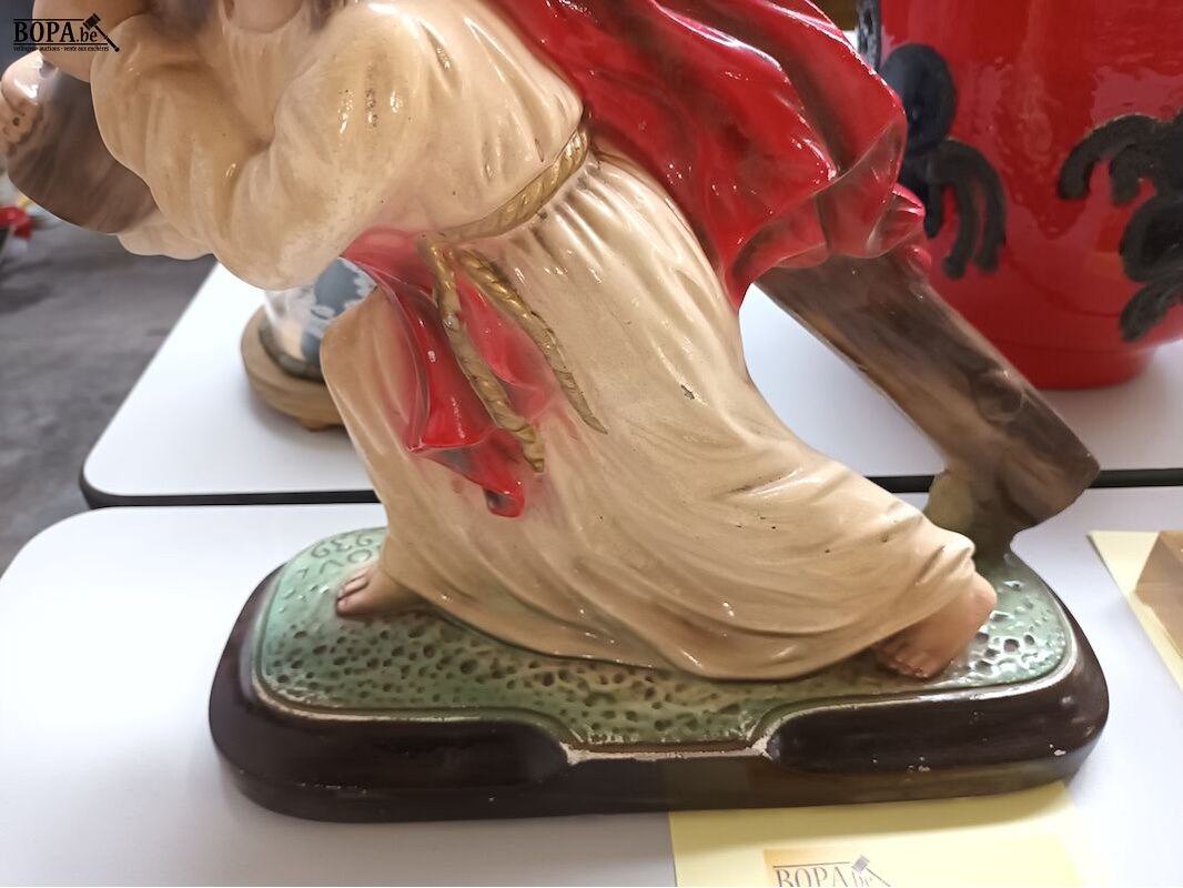 Beeld in plaaster Jezus met kruis getekend Arnova. 39 x 13 x 40 cm.