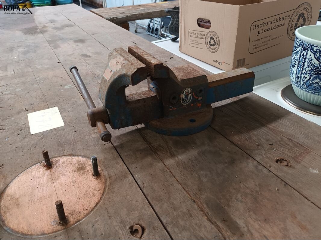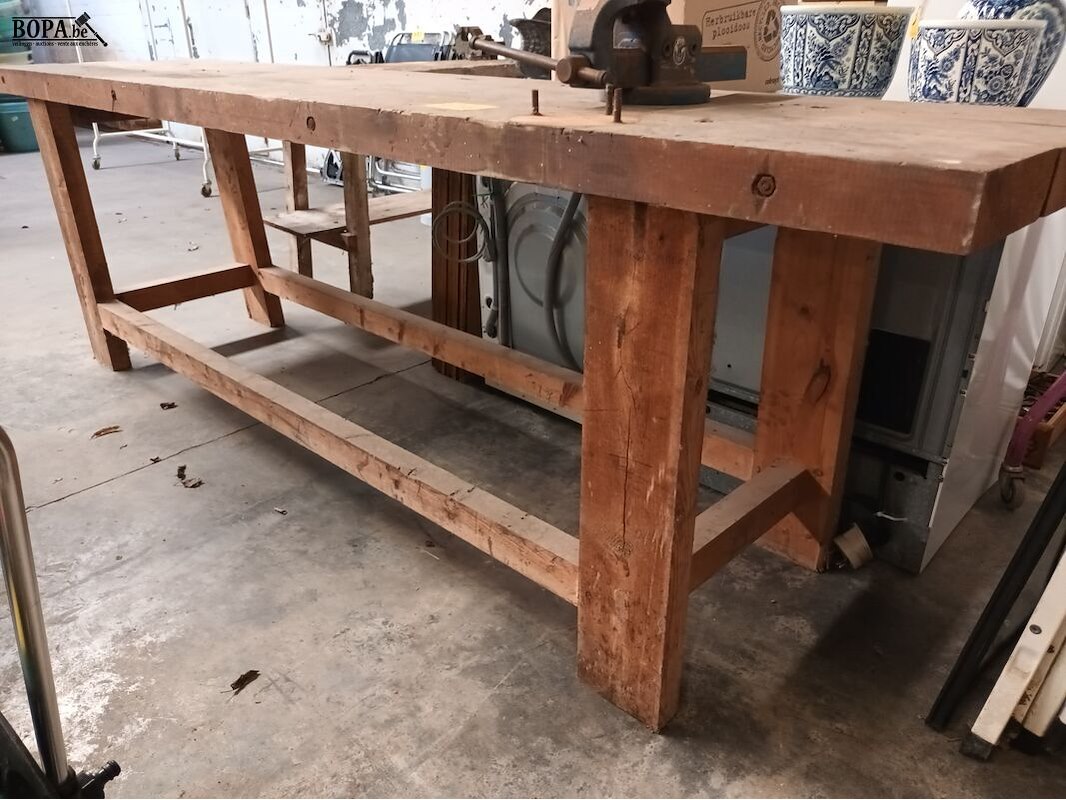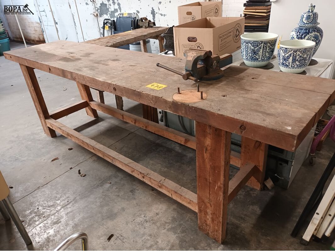 Werkbank met bankschroef. 293 x 66 x 91 cm. Bankschroef met lengte 44 cm.