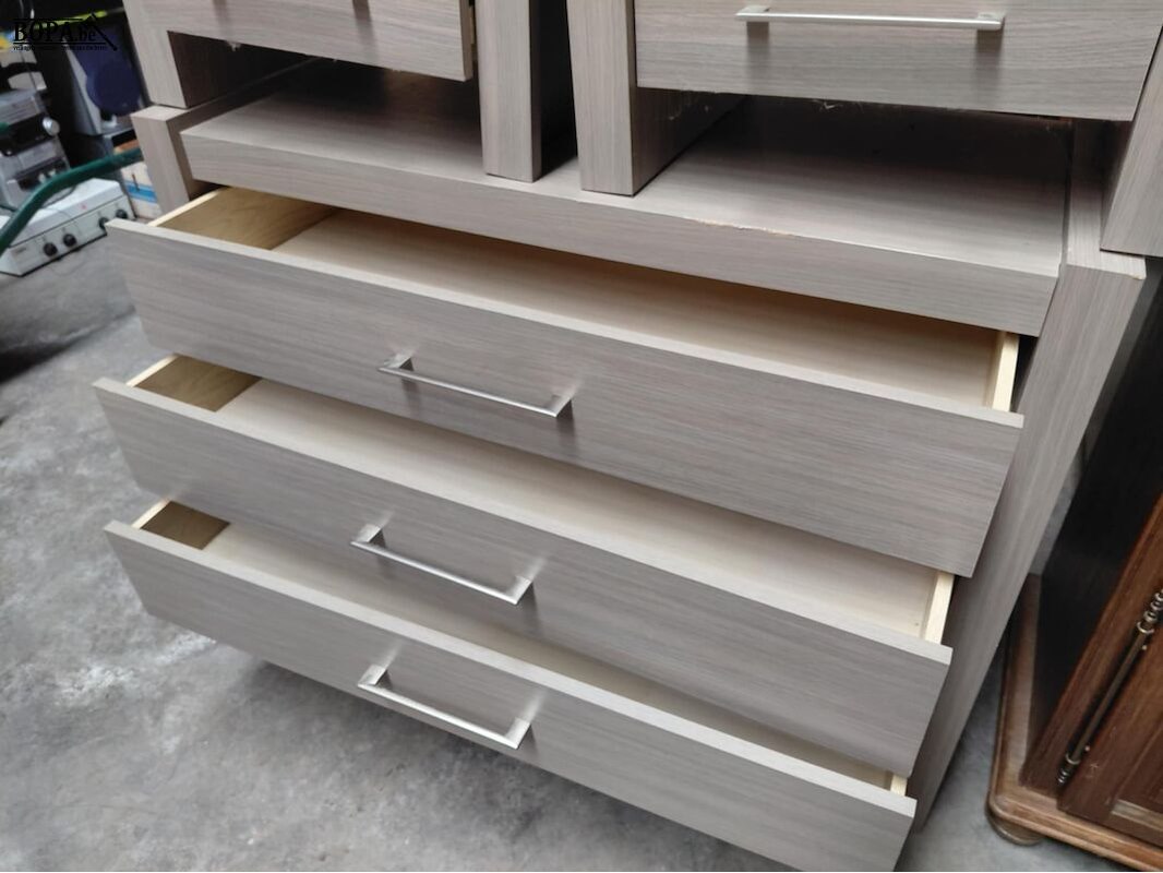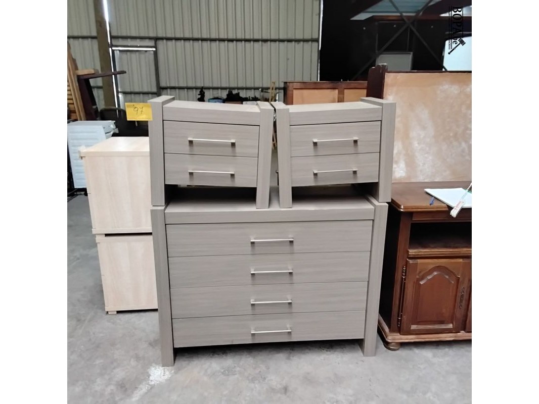 Modern slaapkamermeubilair: ladekast en 2 nachttafels 40 x 55 en H 48 en 1m12 x 47 en H86