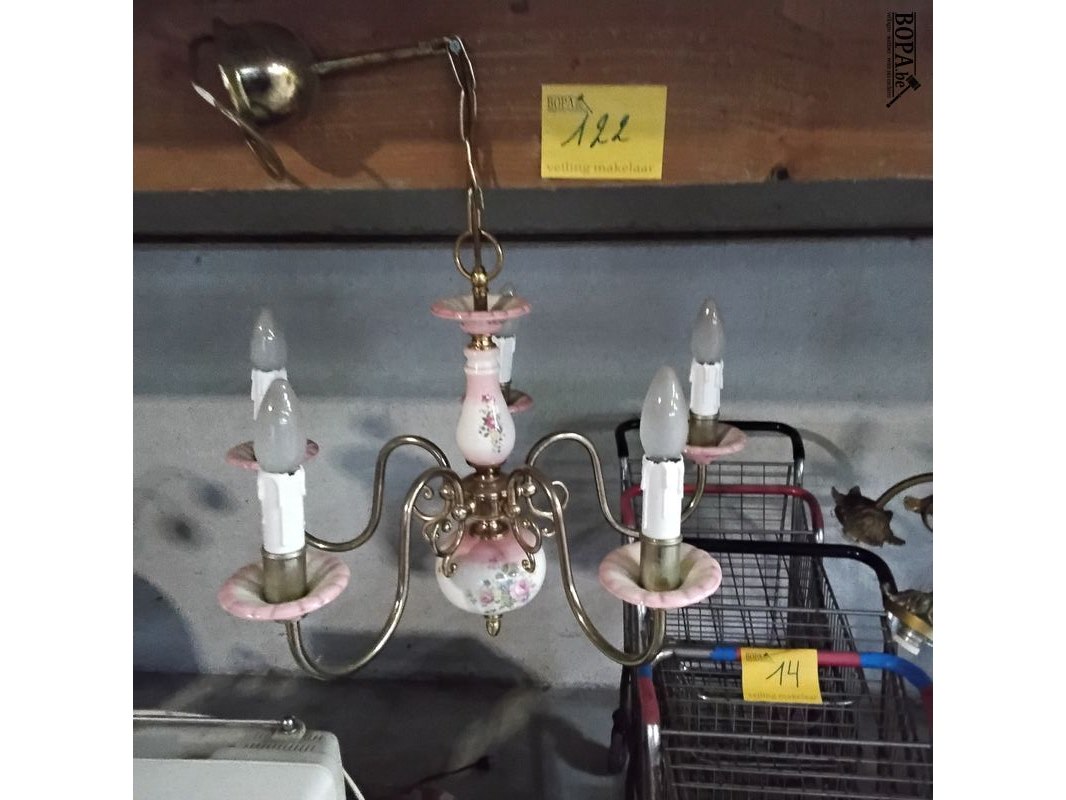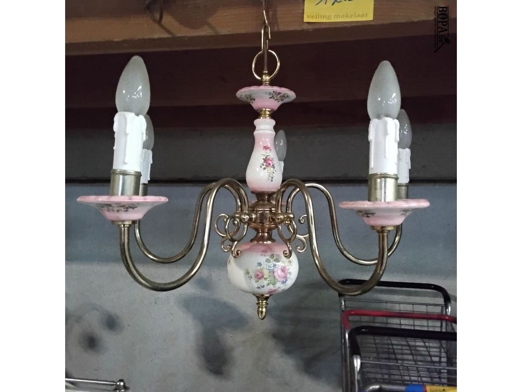 Antieken porseleinen kroonluchter met messing - bloemmotief - rose accenten