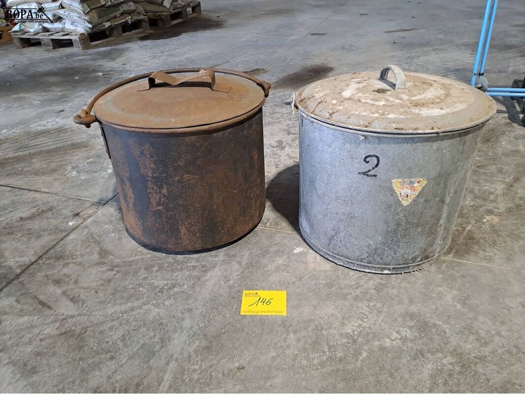 Lot 146 - duo oude zinken ketels met deksel en draaghengel