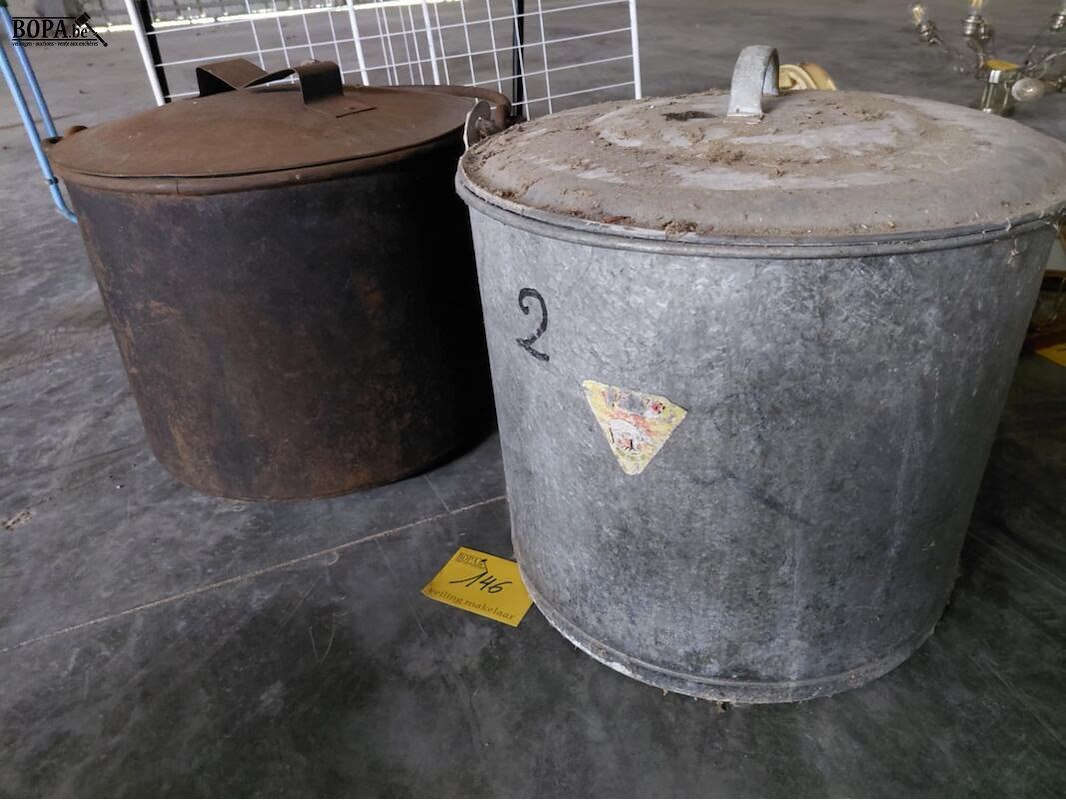 Duo oude zinken ketels met deksel en draaghengel B 45cm H 3cm