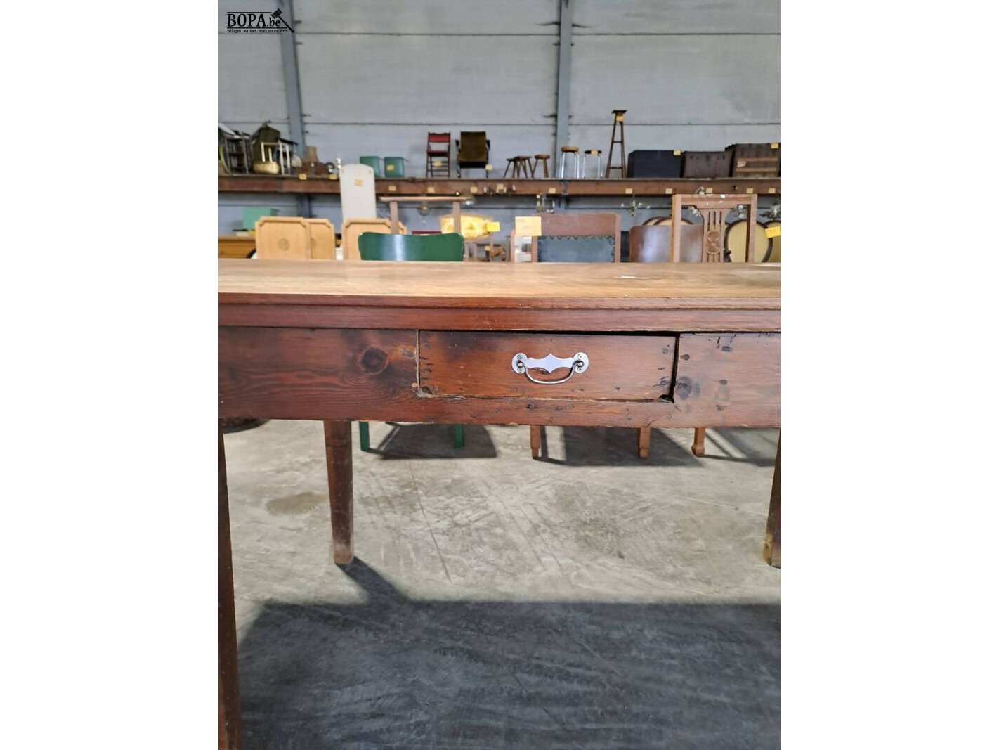 Oude houten bureau met lade voor bureelmateriaal: B 170cm - D 74cm - H 75,5cm