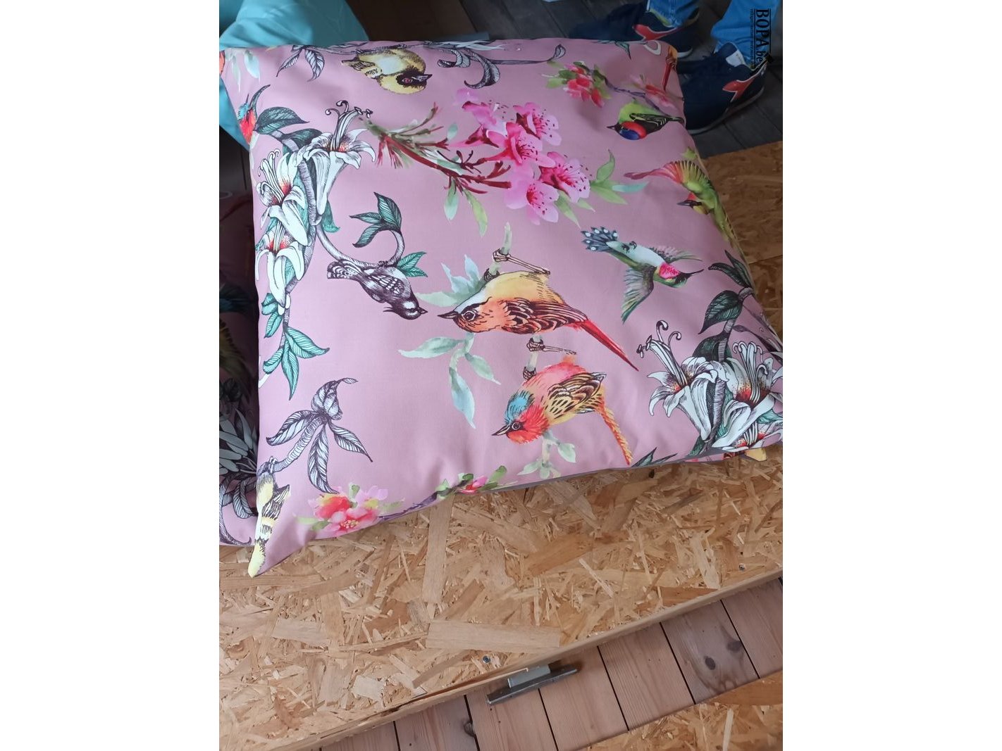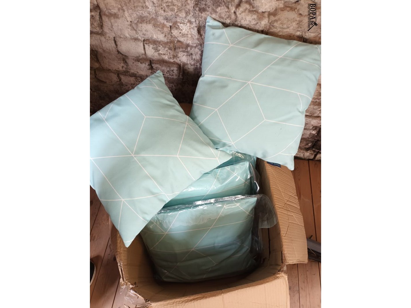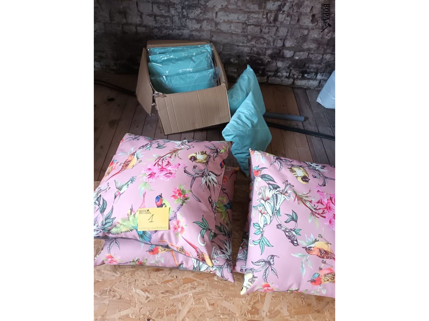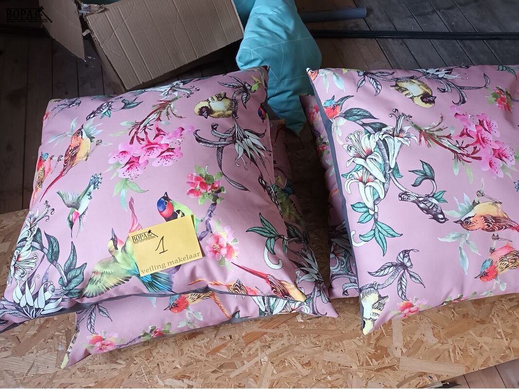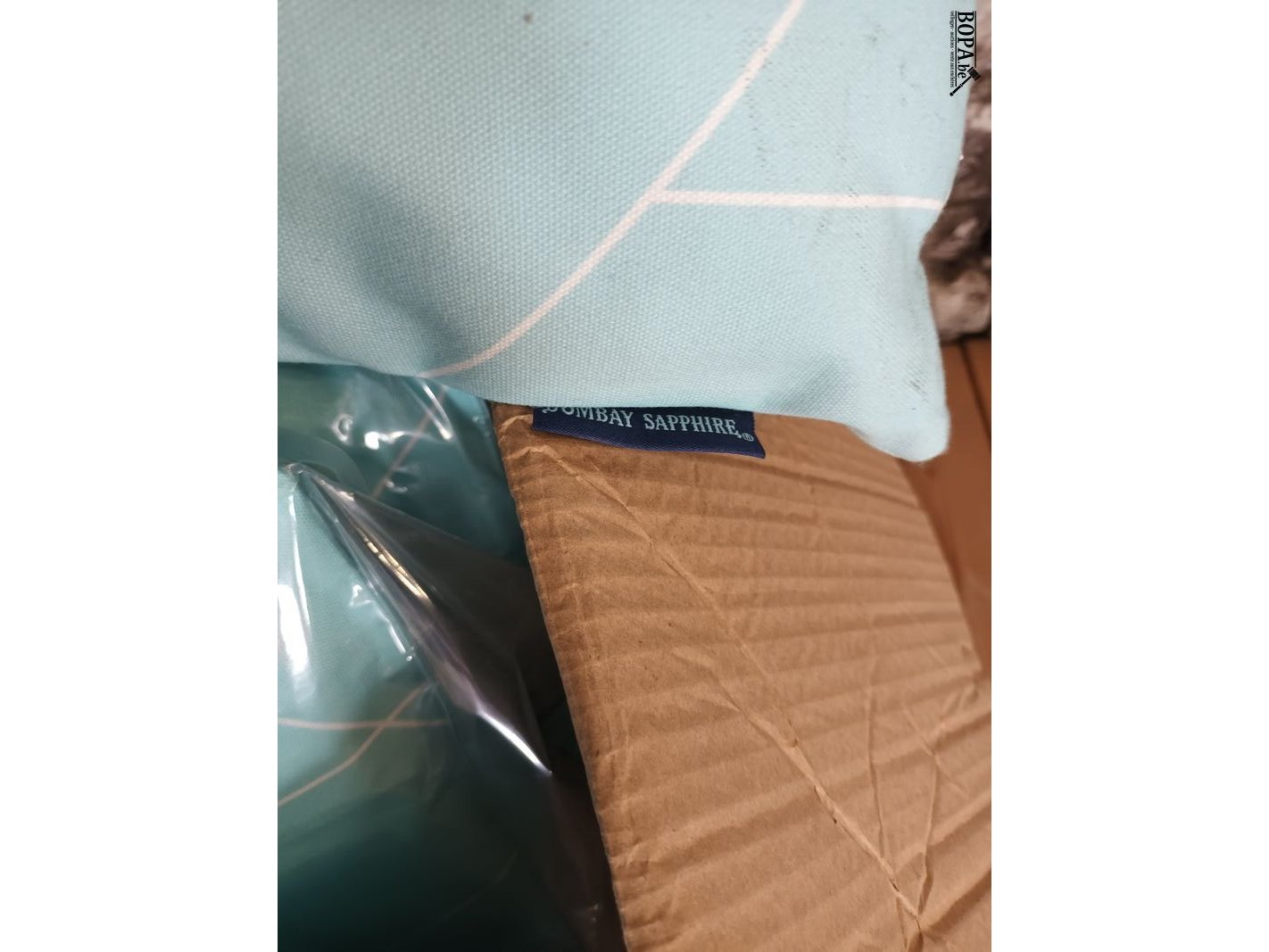4 sierkussens met vogelthema en 8 sierkussens van Bombay Sapphire.