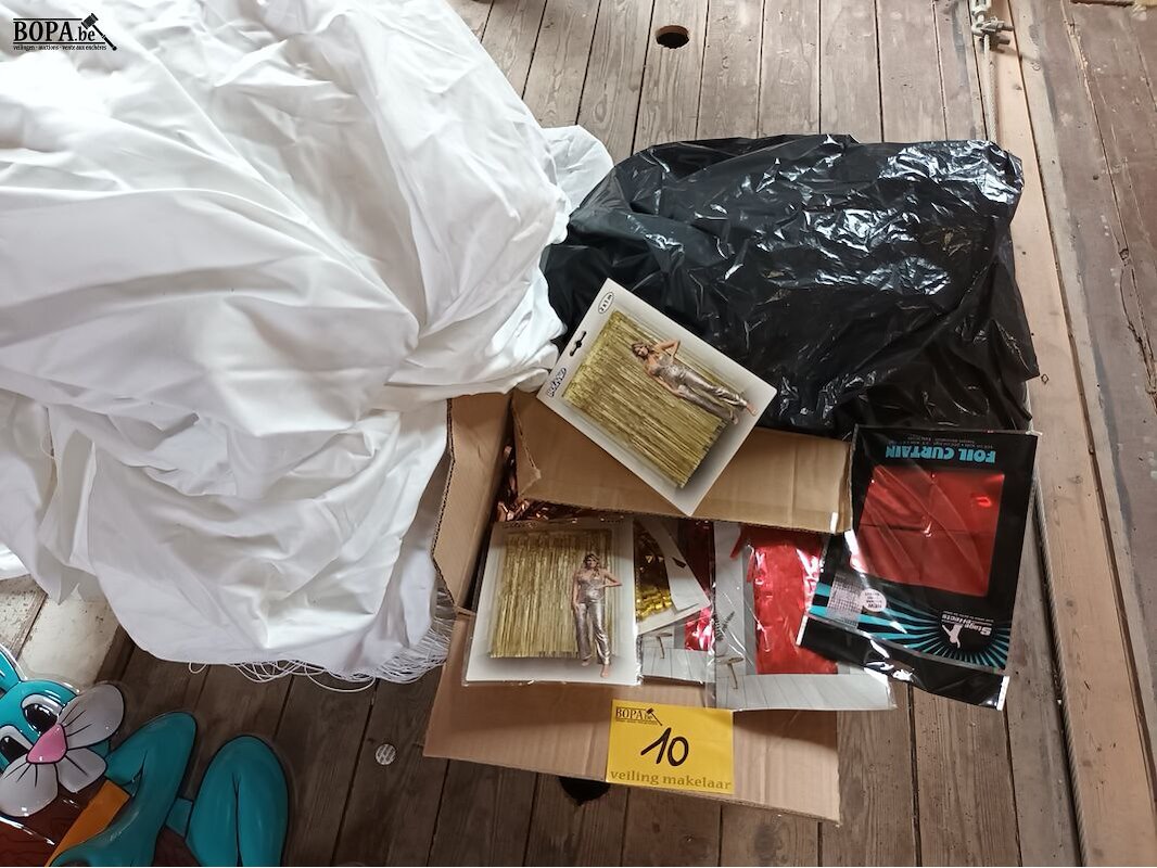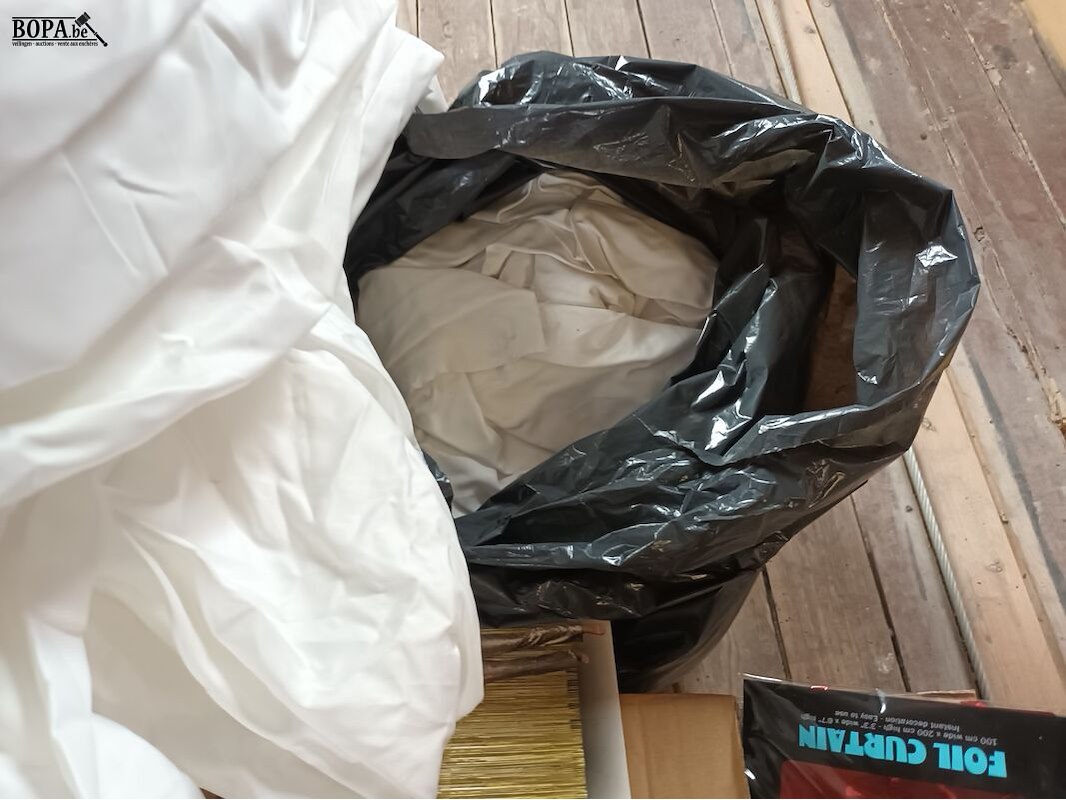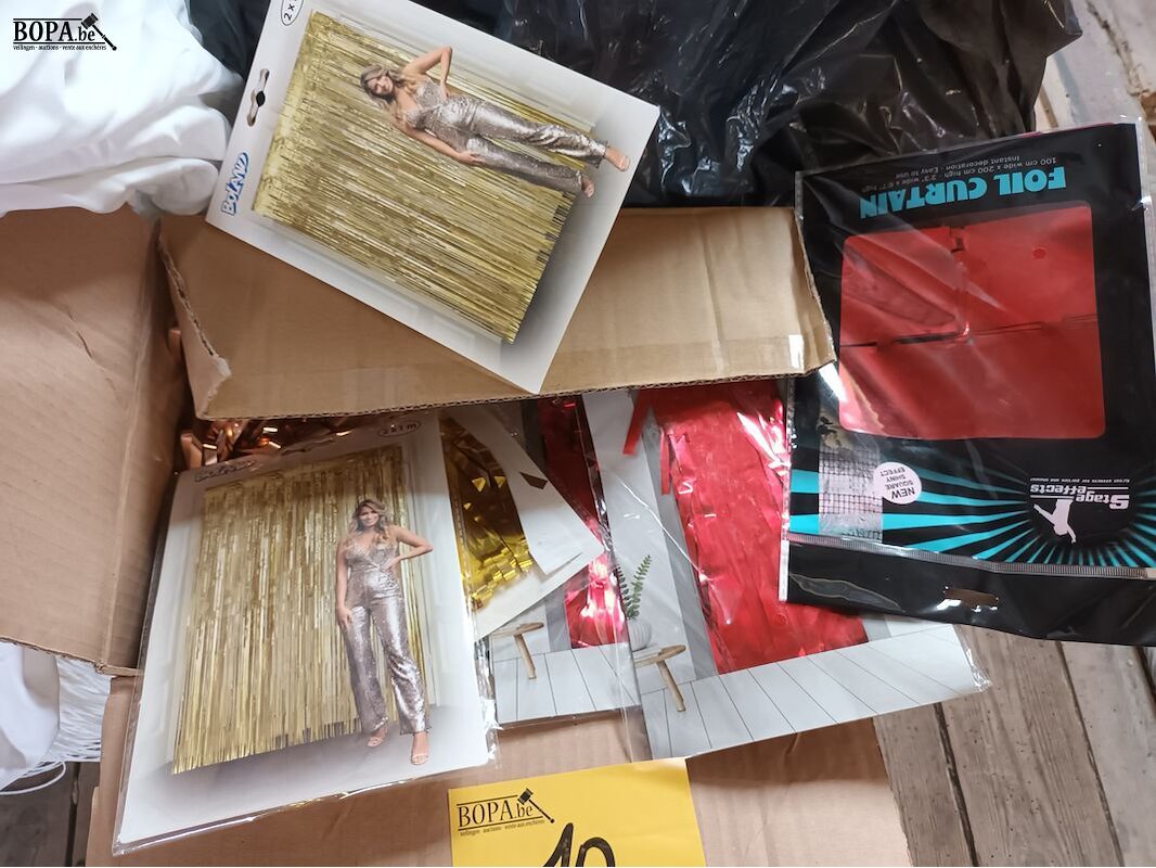 Lot stoffen voor white party en een doos met diverse folie gordijnen.