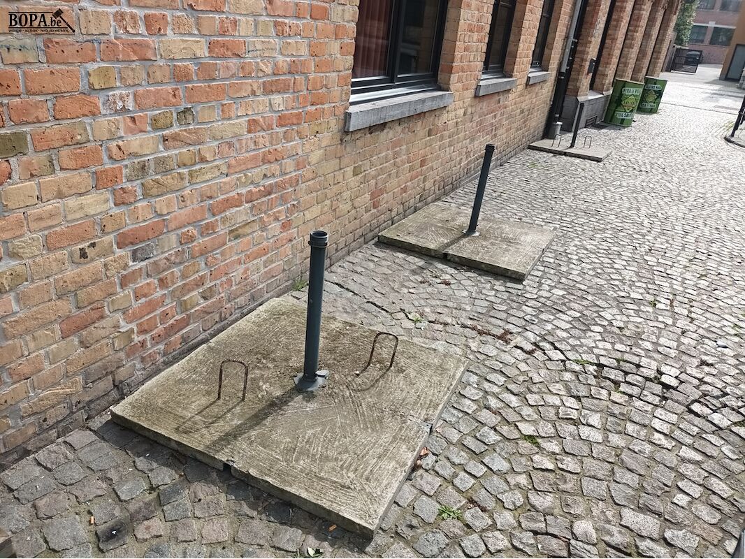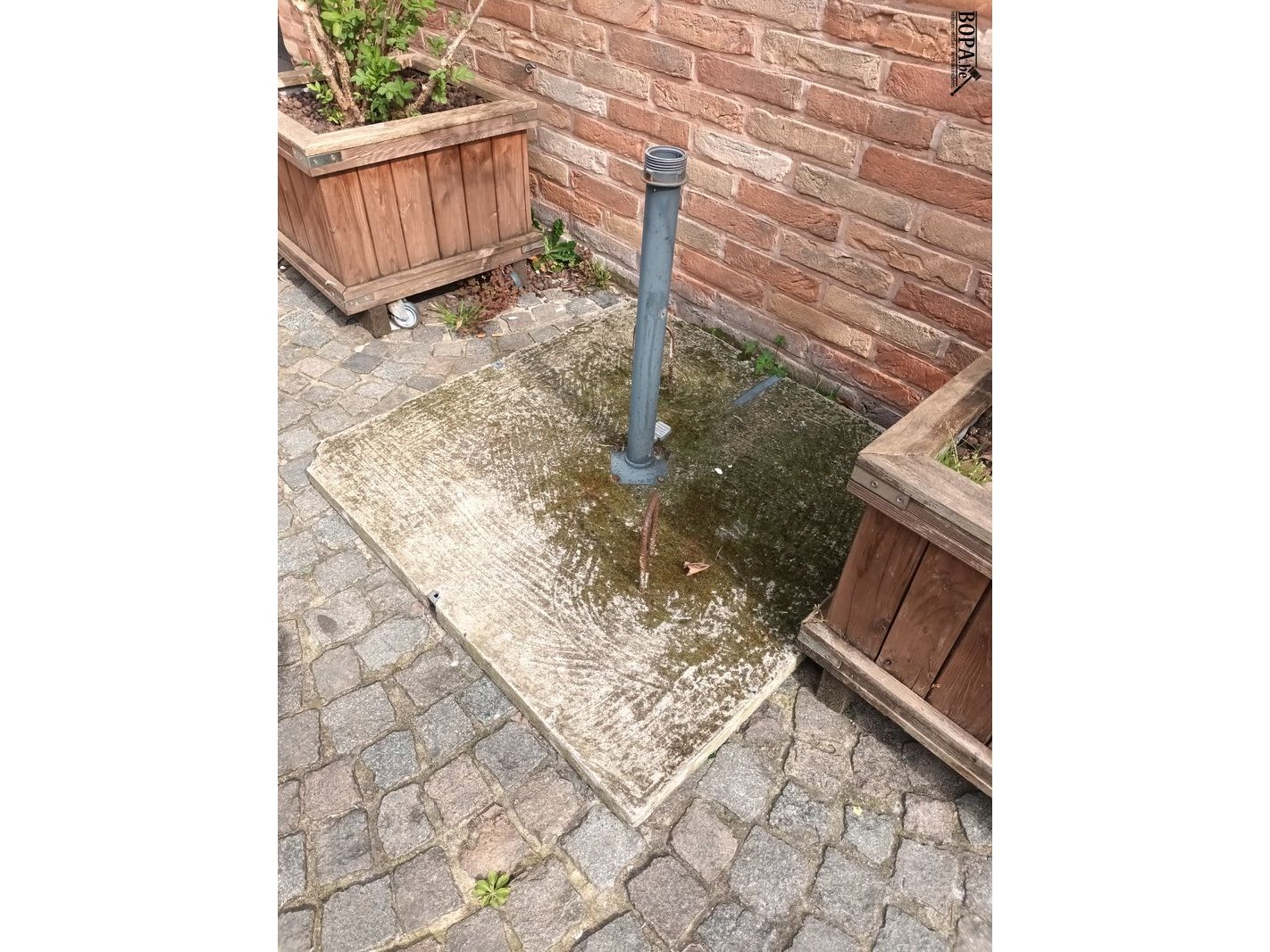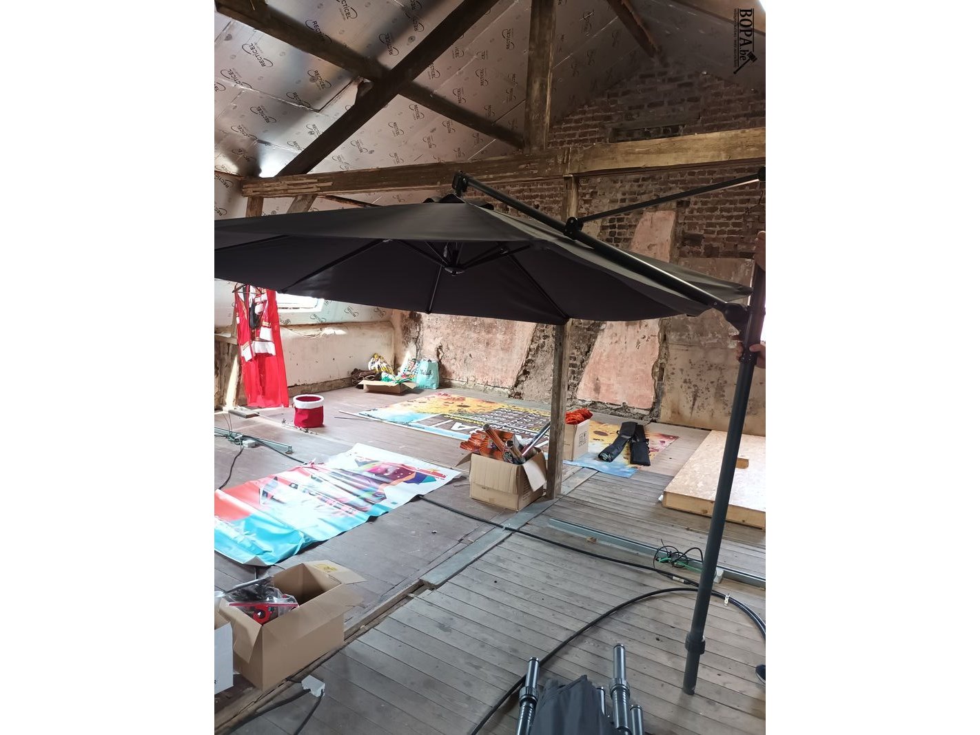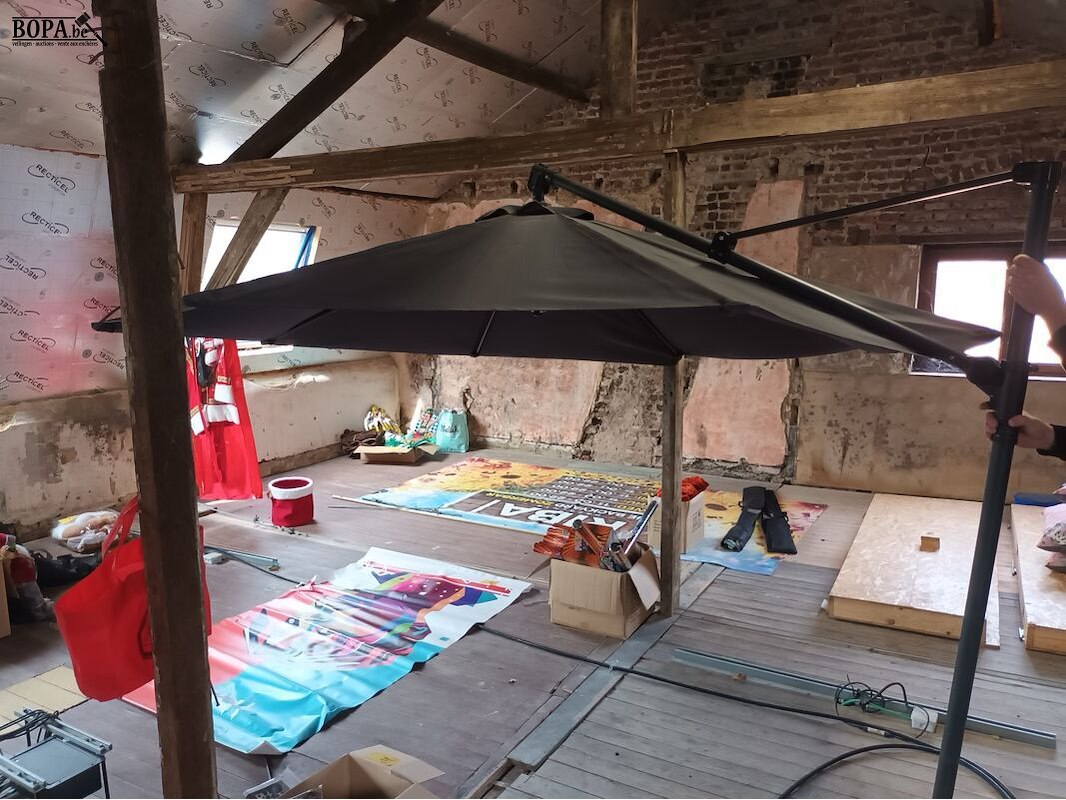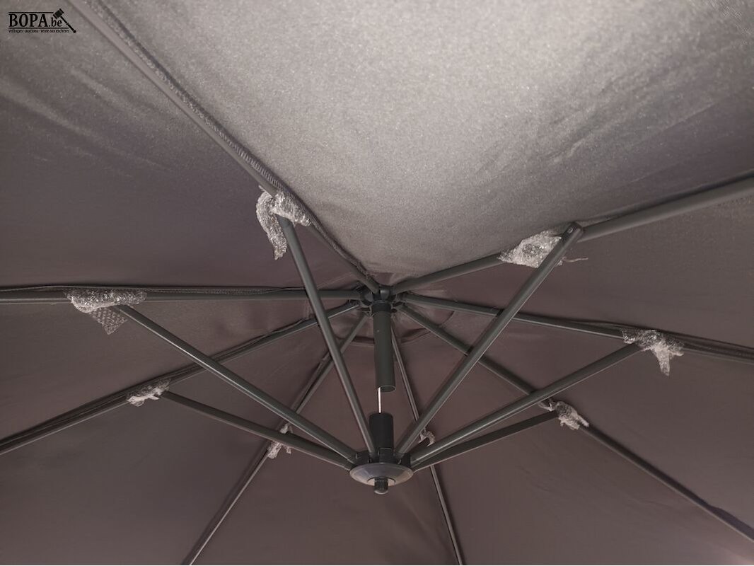5 zweefparasols met diameter 300 cm en 5 parasolvoeten met betonnen grondvlak.