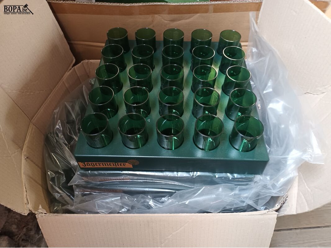 Jägermeister shotglaasjes met dienbladen en reageerbuis shotglaasjes. 2 dozen.