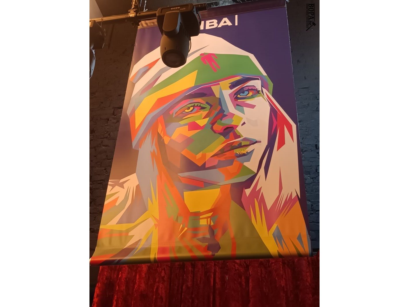 Zeil met afbeelding Billie Eilish. 120 x 200 cm. Reeds gedemonteerd.