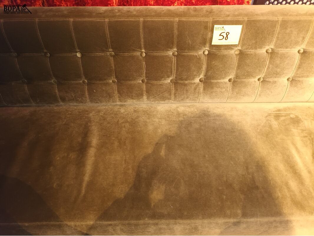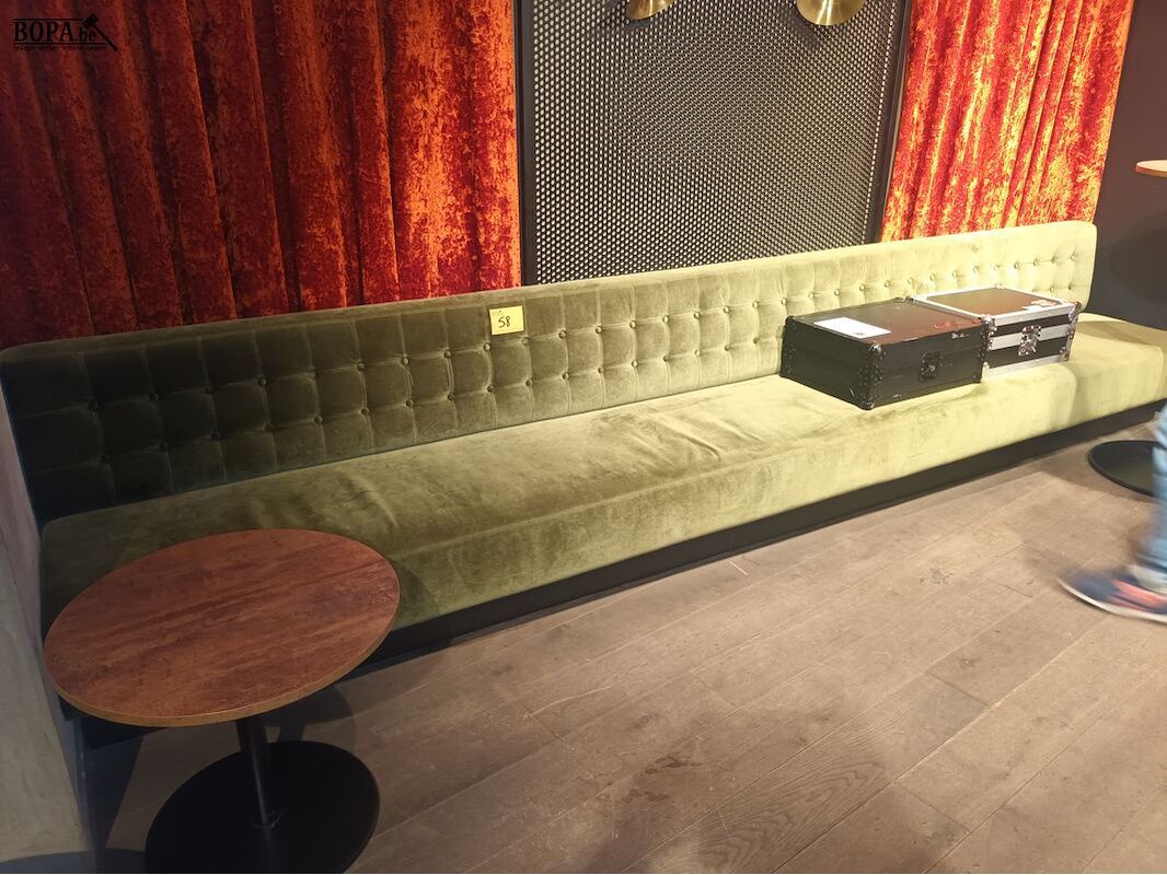Muurbank in groene velours. Lengte 420 cm. Reeds gedemonteerd.