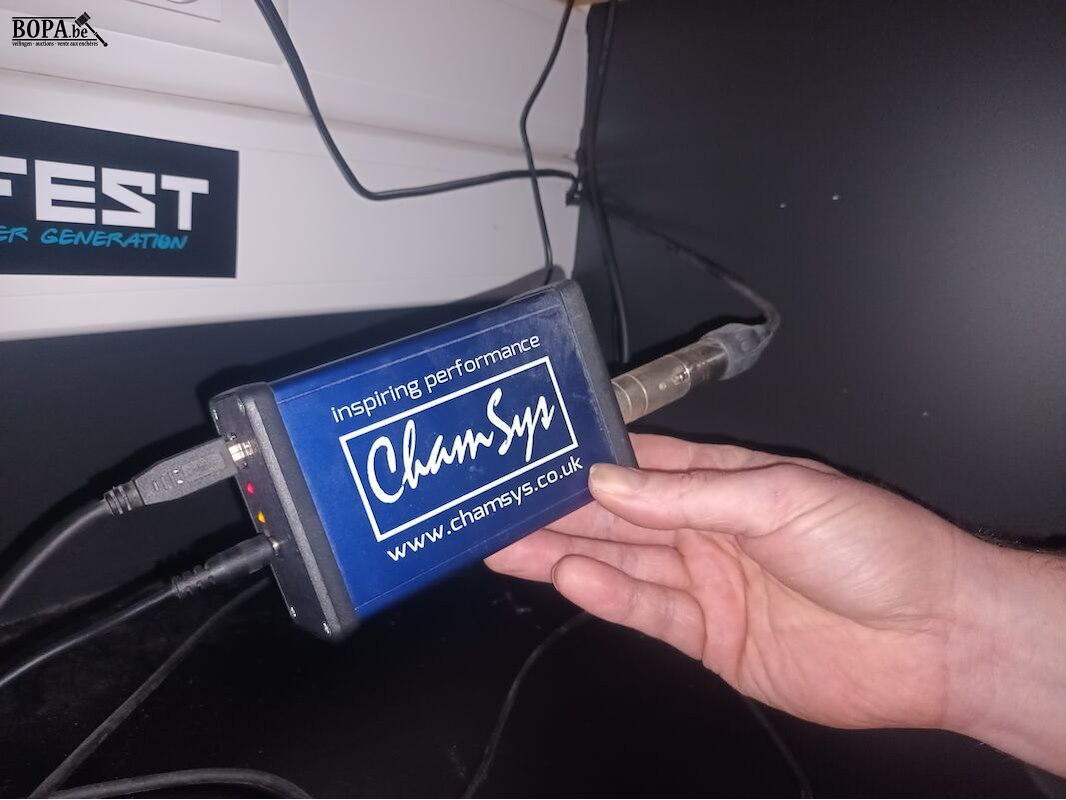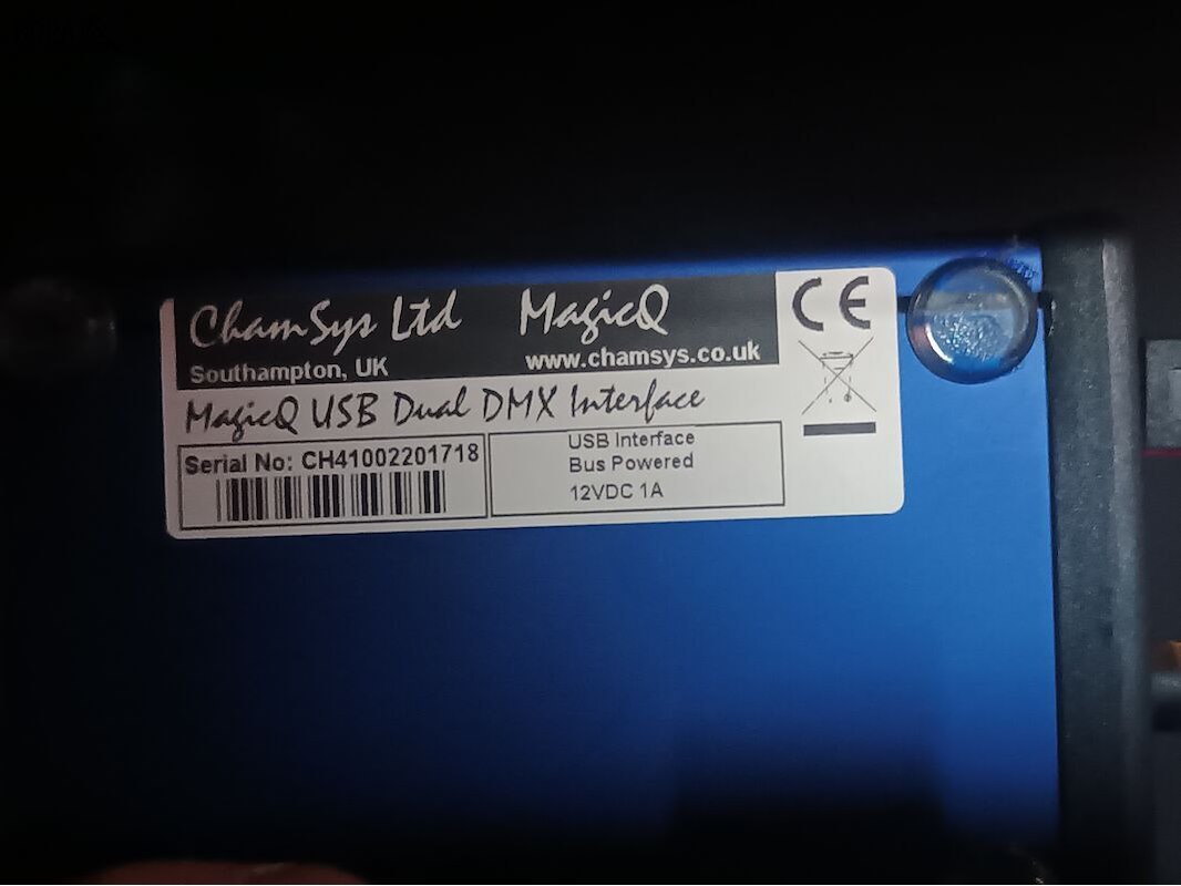 Chamsys besturingssysteem met scherm en MagicQ USB Dual DMX Interface.