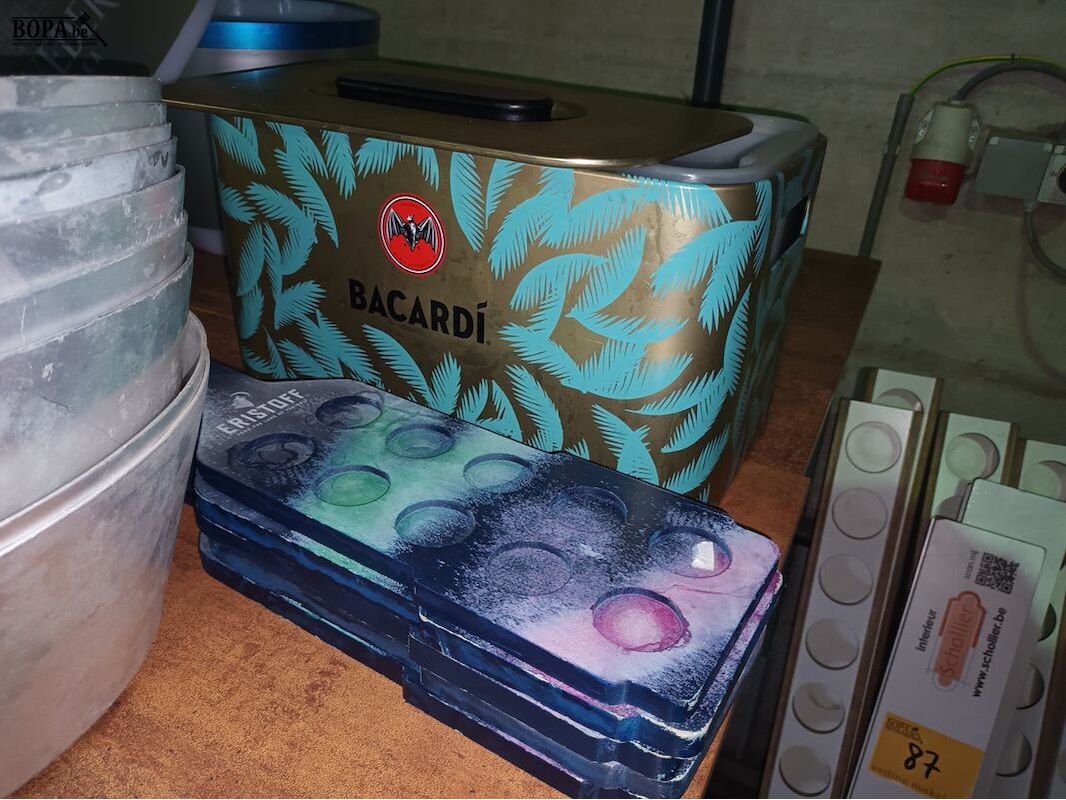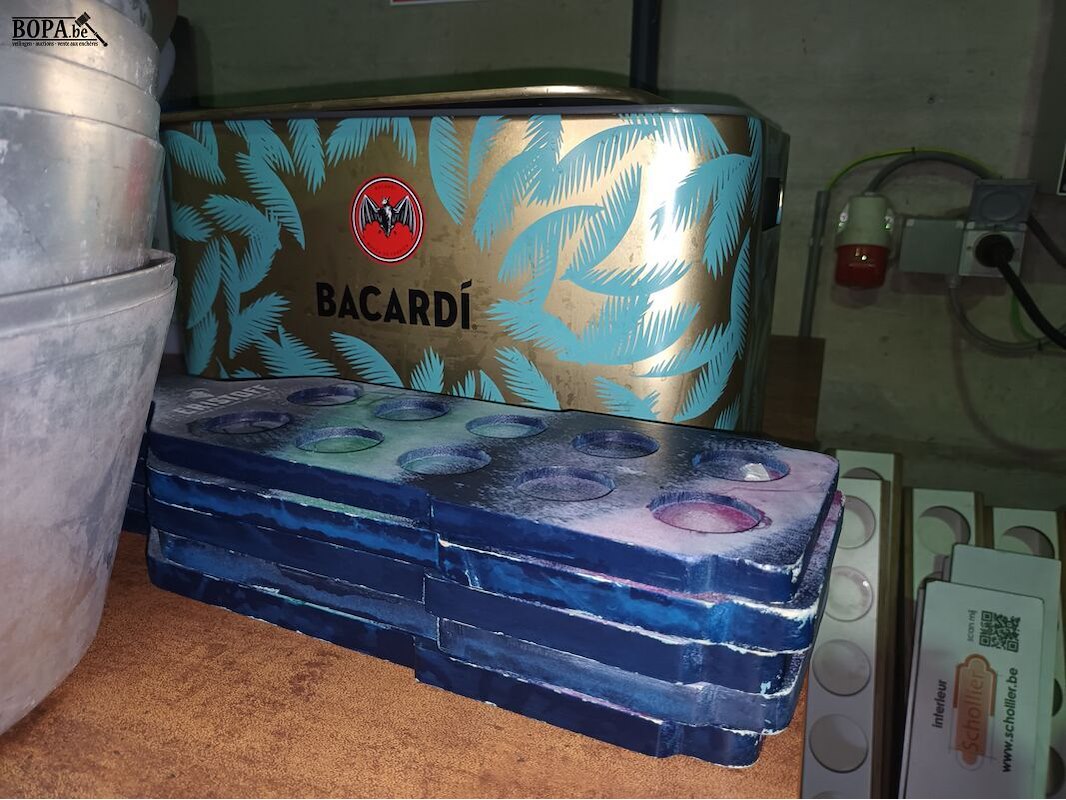 9 ijsemmers Red Bull, 1 ijsemmer Bacardi en 5 serveerplankjes voor Eristoff shotglazen.