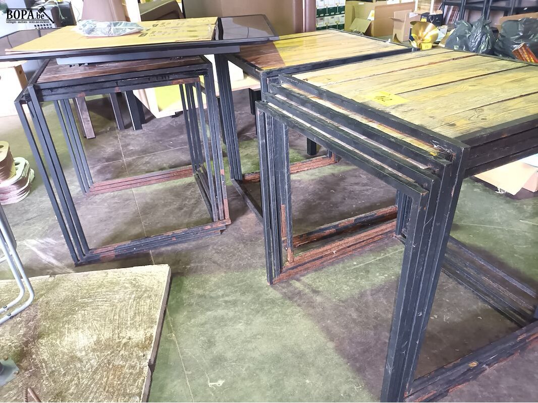 9 x terrastafel met houten blad en metalen onderstel. 70 x 70 x 78 cm.