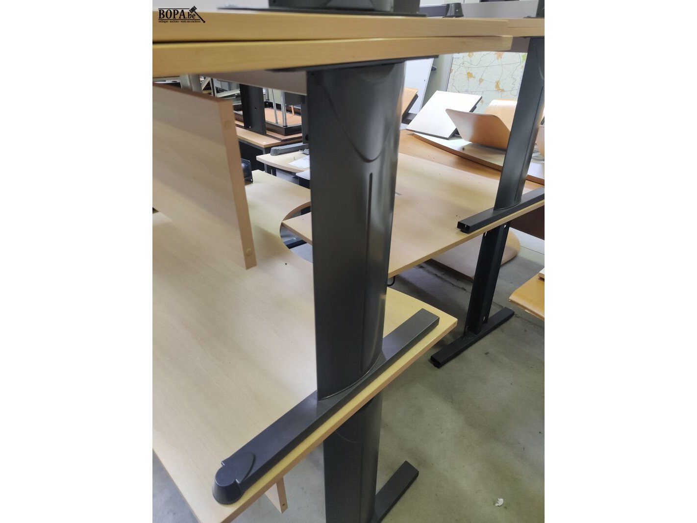 3 gebogen burelen met houtlook bovenblad 160 x 120 cm, en 2 aanbouw ladenblokjes, 42 x 60 x hoogte 72 cm